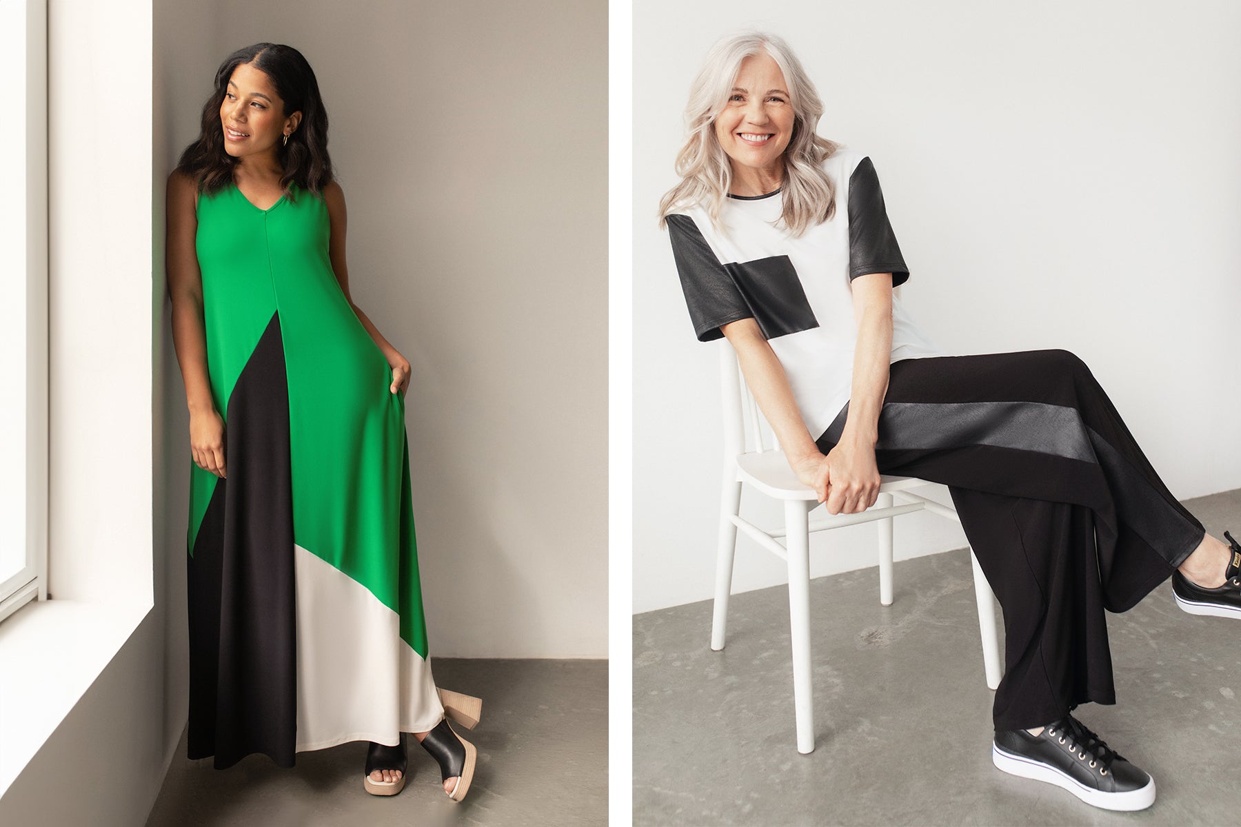One of the highlights of the collection is the mix-and-match options available. Whether it's pairing the Boxy T with Faux Leather with the new-in Mix Wide Leg Trouser with Faux Leather, or a statement dress like the new Colour Block Reversible Triangle Sleeveless Dress that will easily be layered as the days grow cooler, the possibilities are endless.