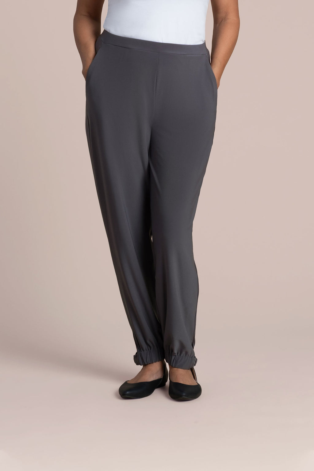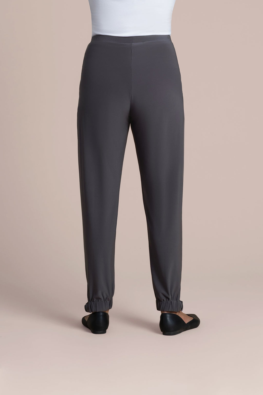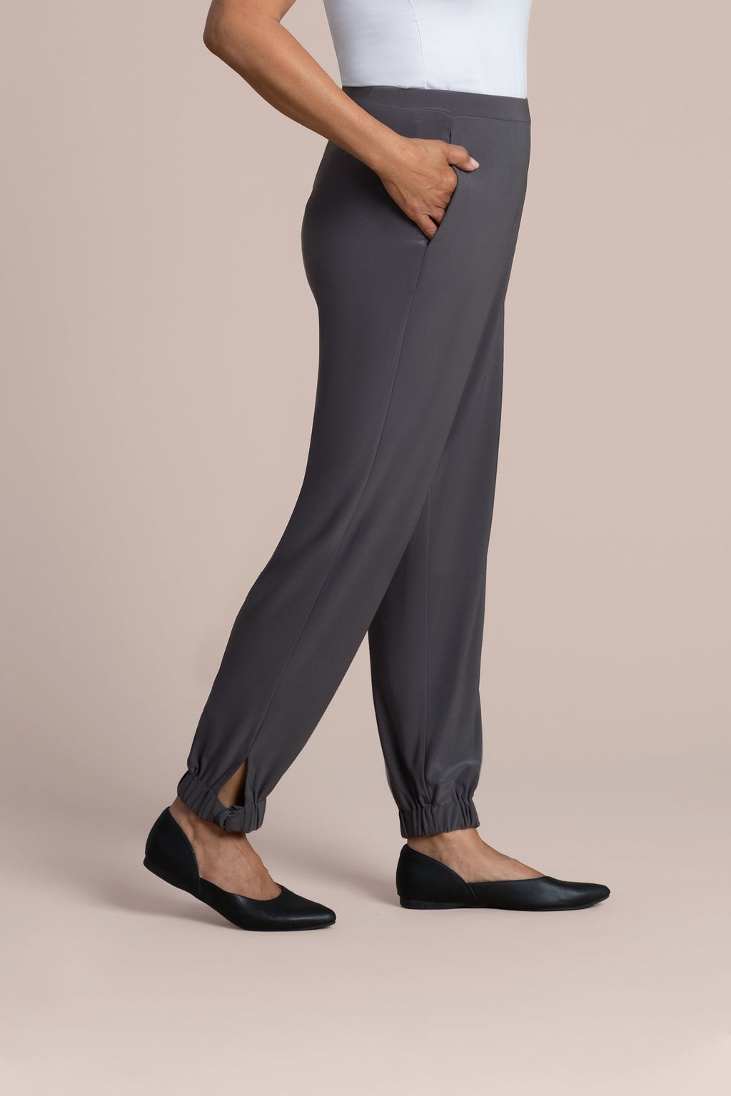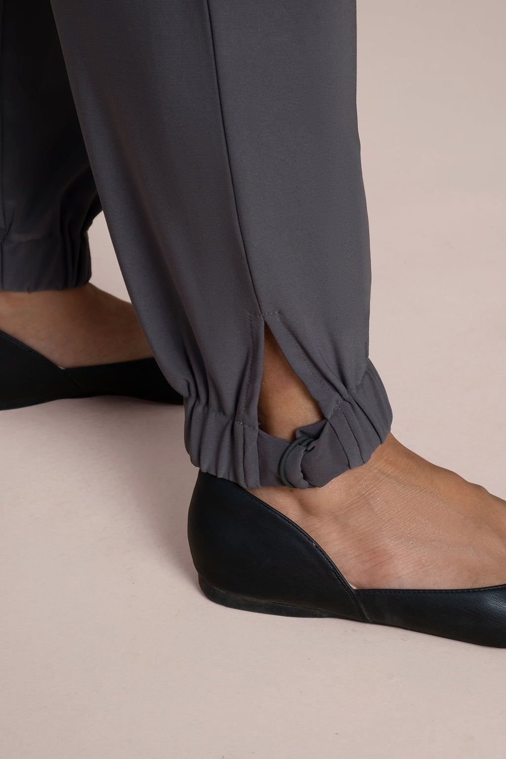 - Tapered leg with gathered elastic cuffs finished with dye-to-match D-rings and subtle side slits.