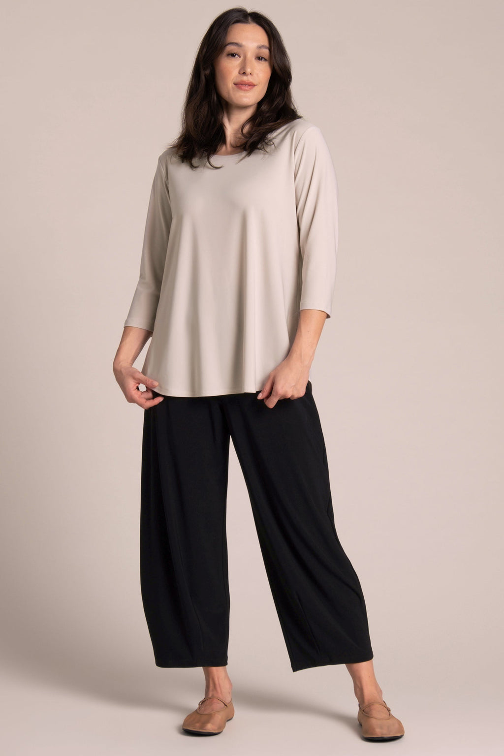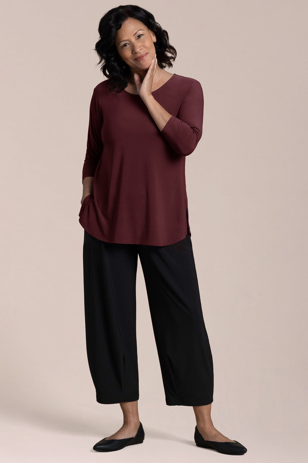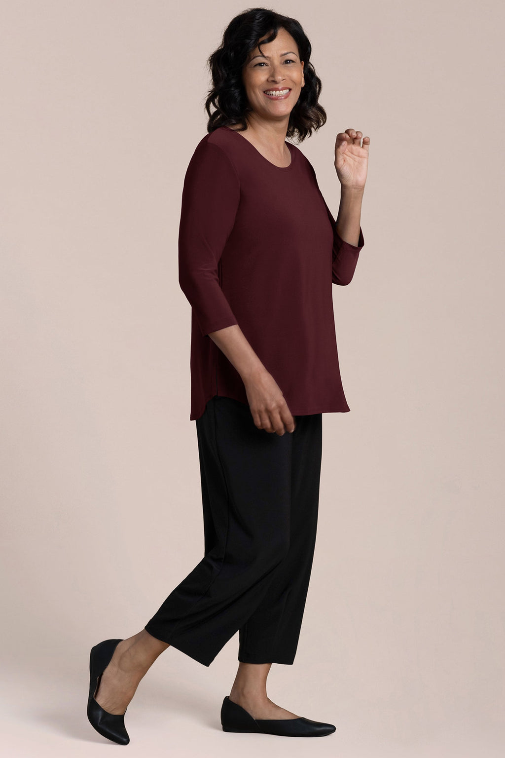 I have found the "Go To Tee Relaxed 3/4 sleeve" top to be a most versatile piece in my wardrobe. I am 5'5" and the top is longer on me than in the photos. The sleeves are snug but not too tight and the body of the top skims over my body. Sometimes a piece is "too loose" and it ends up making you look larger than you actually are--as if you are trying to hide "something". This piece does not do this. I am a size 10 in this toto. Works well with your favorite pants or you can add a piece on top of it such as a vest for a more polished look or a smock. Just love this piece. The neckline is perfect to add a short necklace, loner necklace , scarf or nothing. I like that it is always offered and comes in a variety of colors. Wish it would be offered in more jewel tones, such as royal purple or true red. Fantastic in Lapis