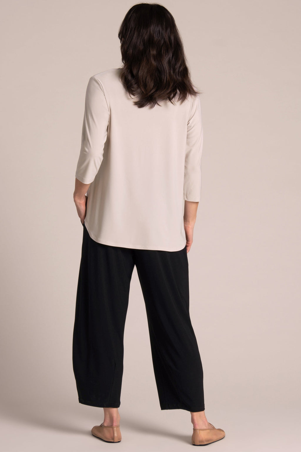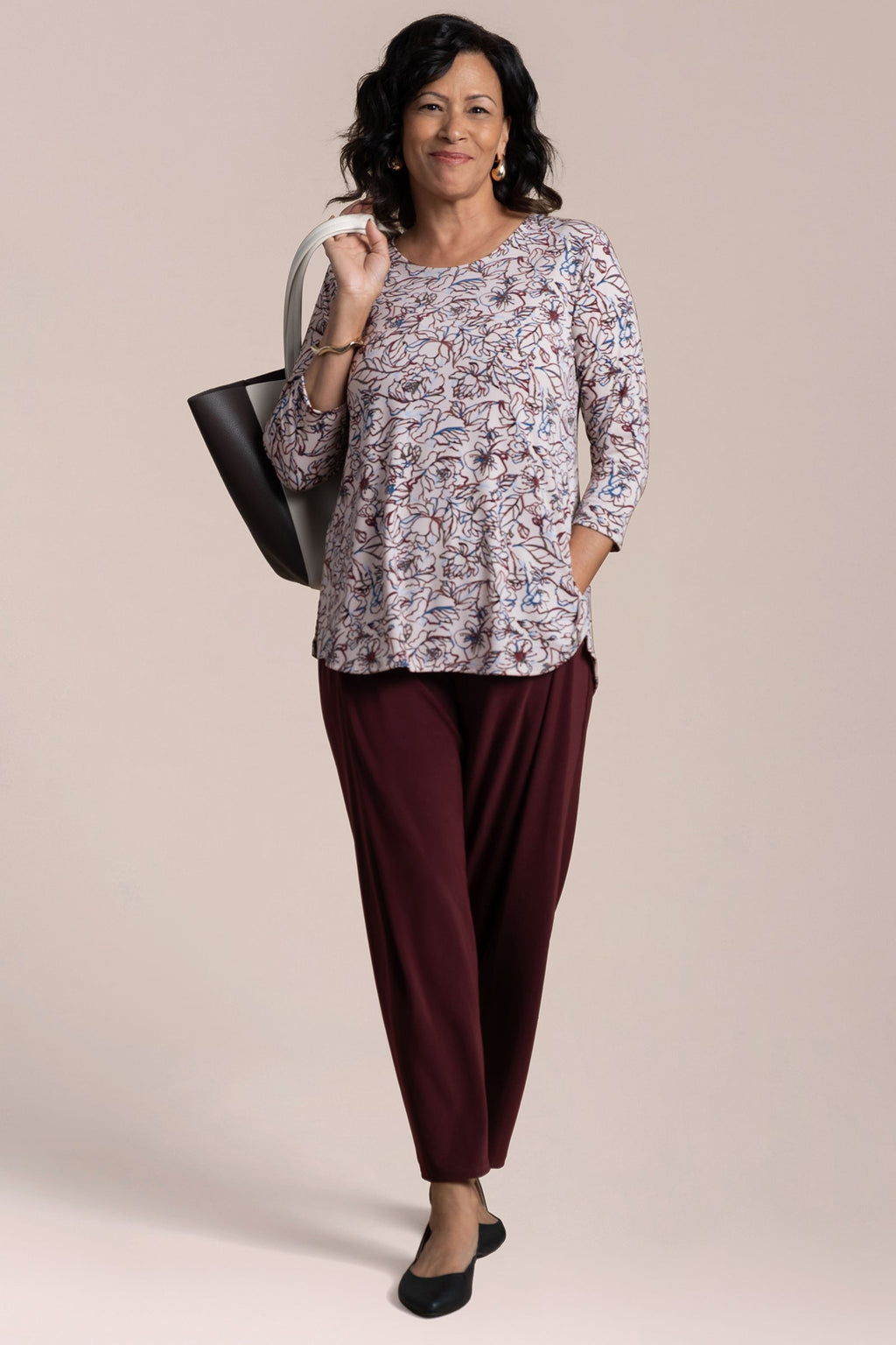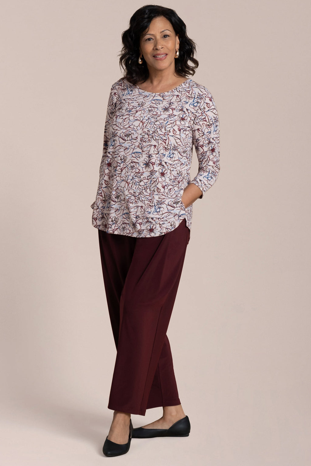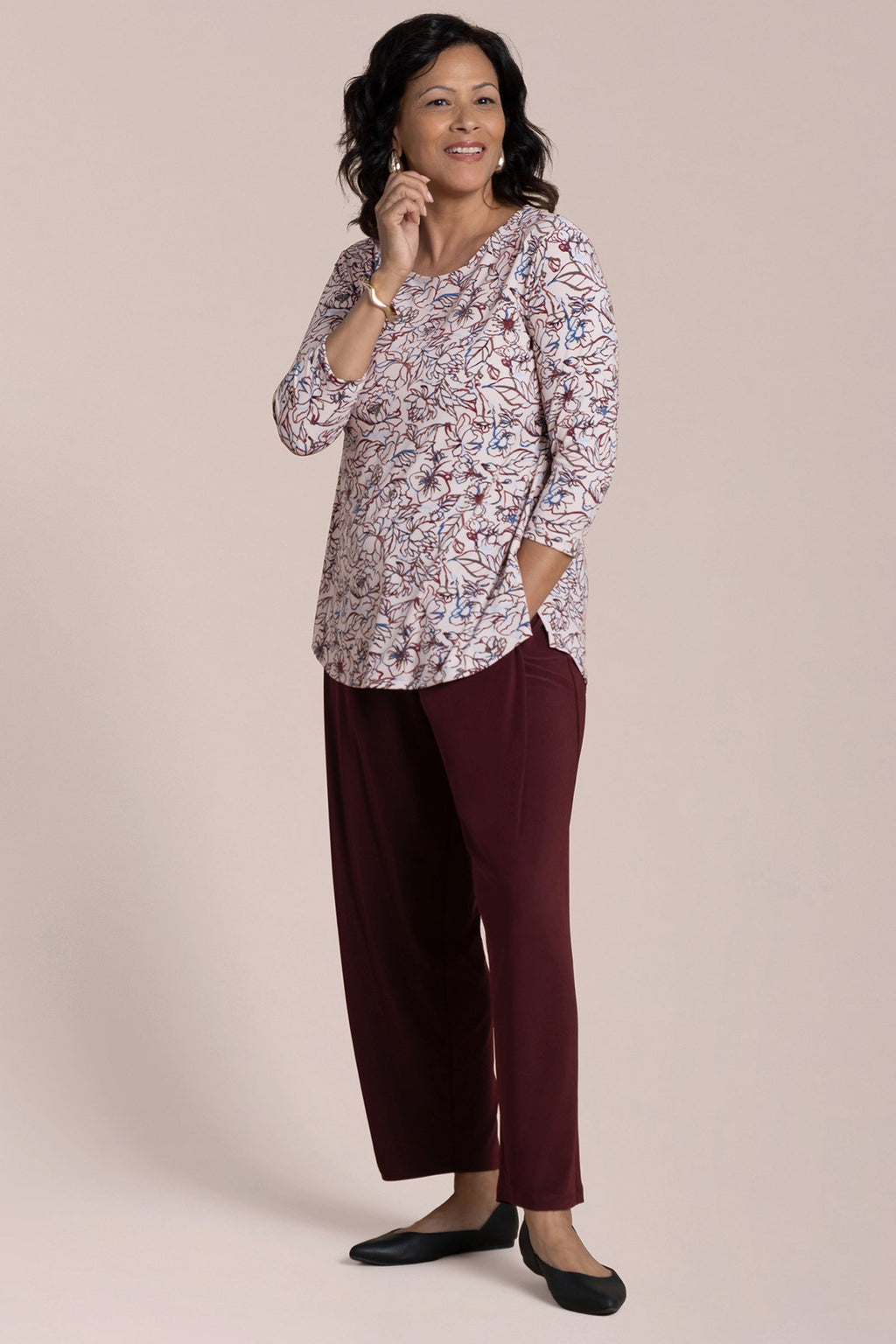 I have found the "Go To Tee Relaxed 3/4 sleeve" top to be a most versatile piece in my wardrobe. I am 5'5" and the top is longer on me than in the photos. The sleeves are snug but not too tight and the body of the top skims over my body. Sometimes a piece is "too loose" and it ends up making you look larger than you actually are--as if you are trying to hide "something". This piece does not do this. I am a size 10 in this toto. Works well with your favorite pants or you can add a piece on top of it such as a vest for a more polished look or a smock. Just love this piece. The neckline is perfect to add a short necklace, loner necklace , scarf or nothing. I like that it is always offered and comes in a variety of colors. Wish it would be offered in more jewel tones, such as royal purple or true red. Fantastic in Lapis
