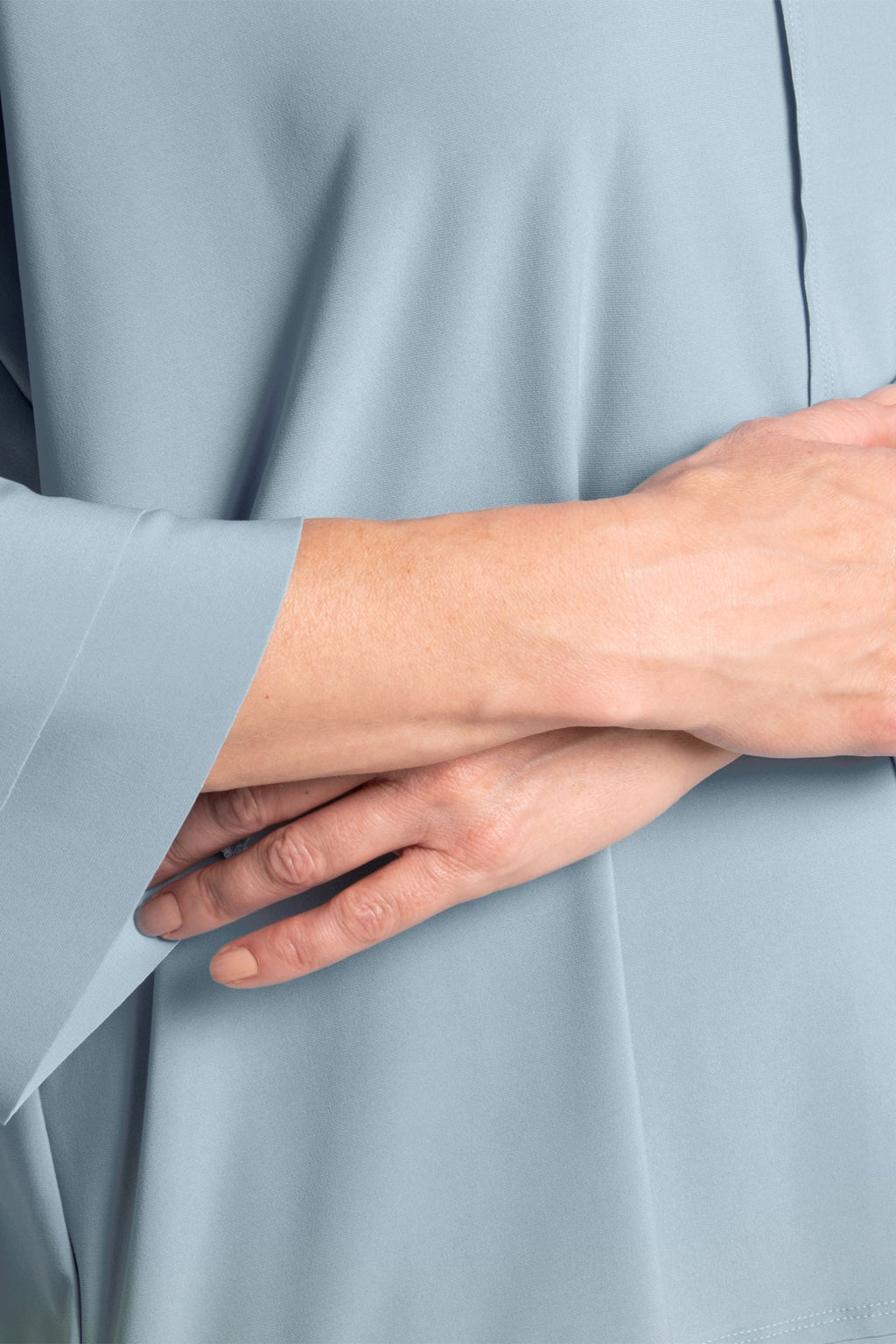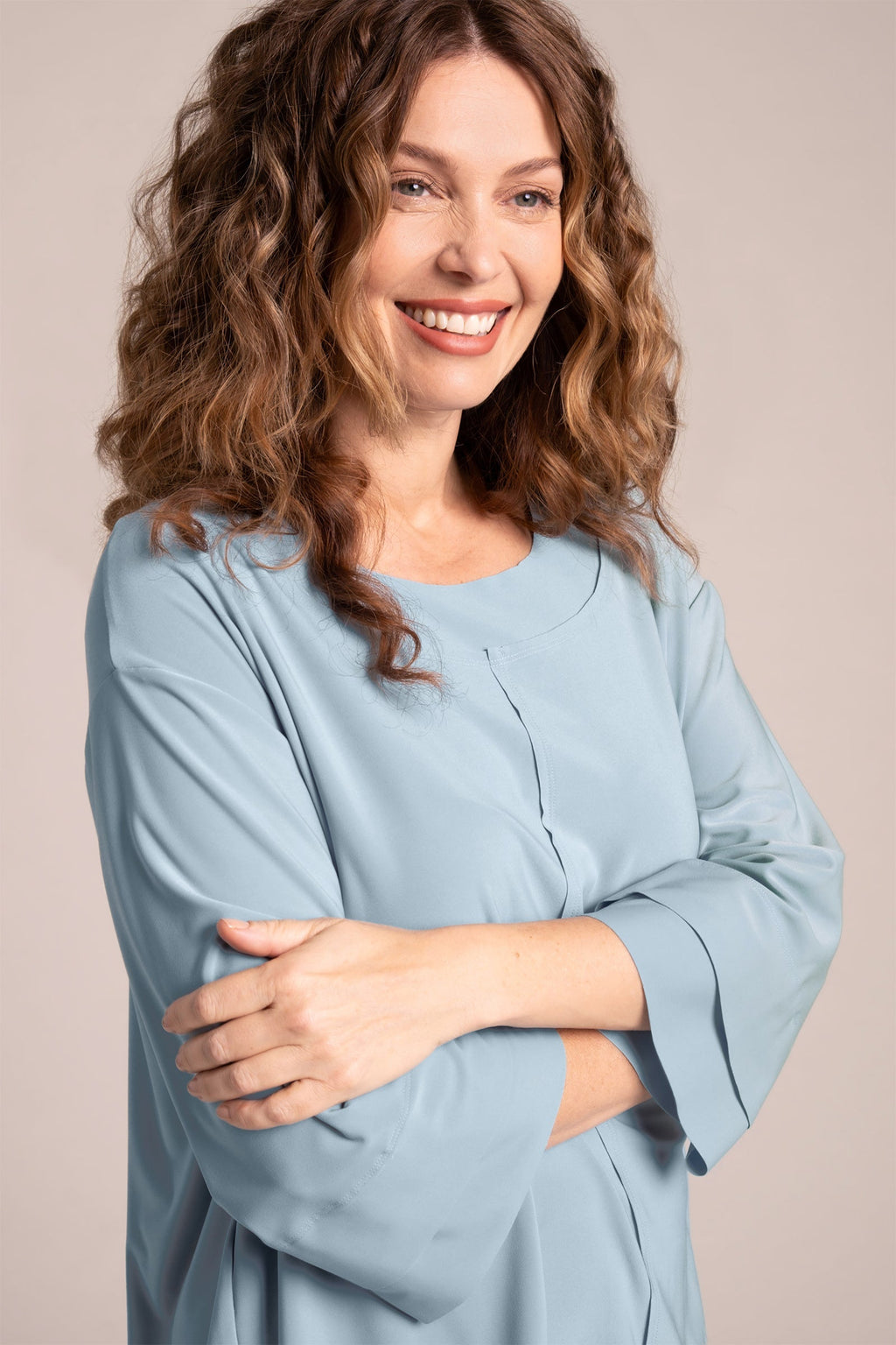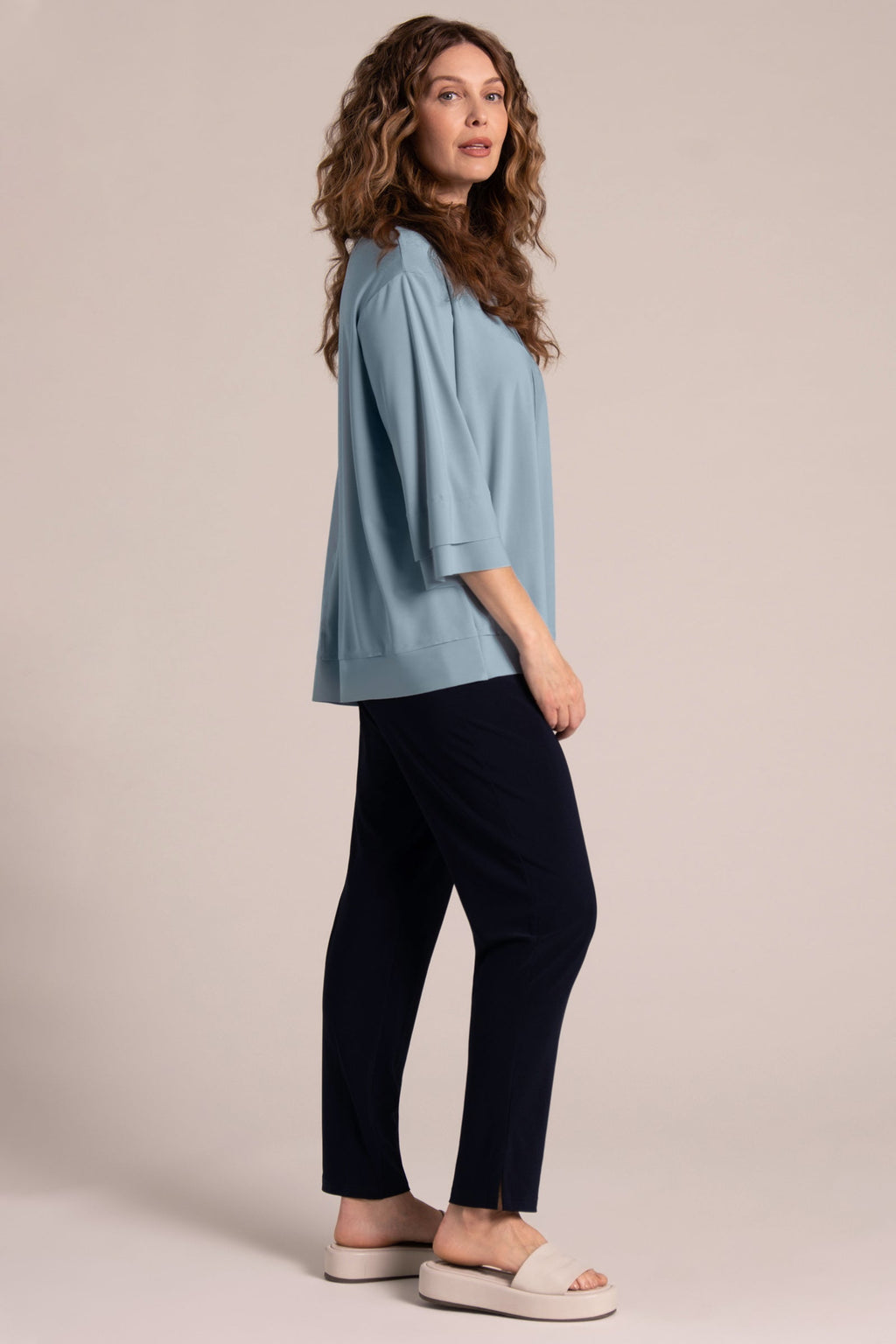 This easy-to-style top features a round neckline and classic fit. The slightly wider sleeves provide an effortless throw-on-and-go feel, while the raw edge hems add a touch of interest.