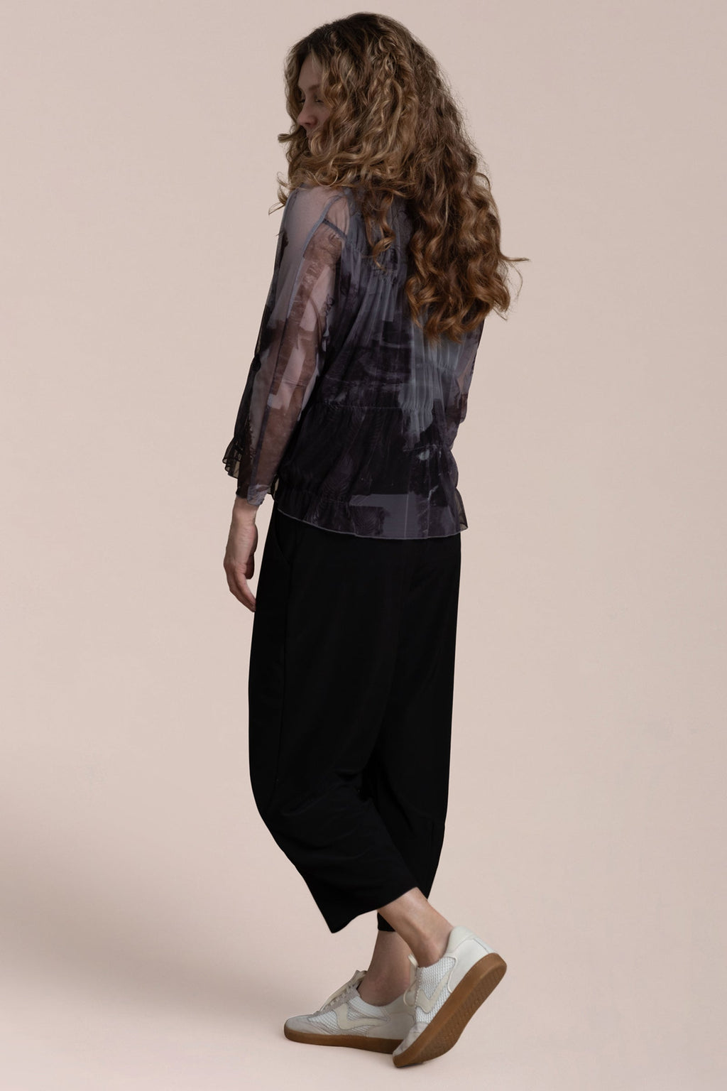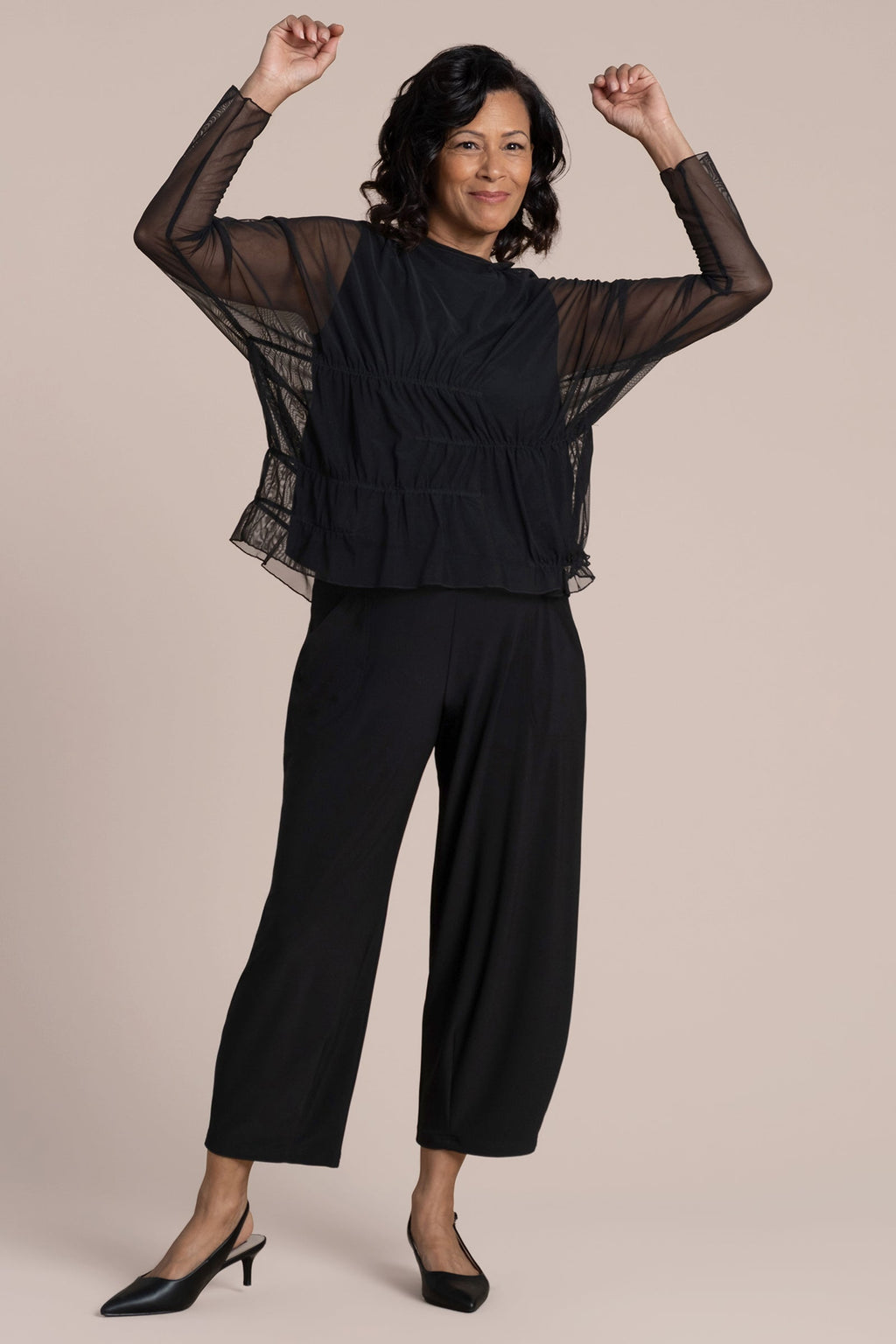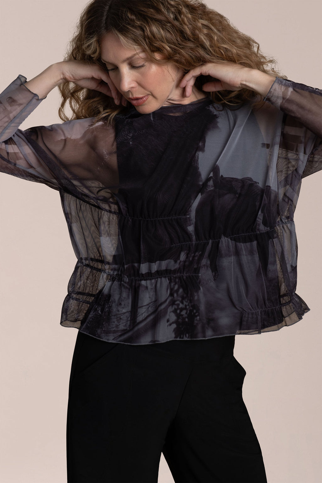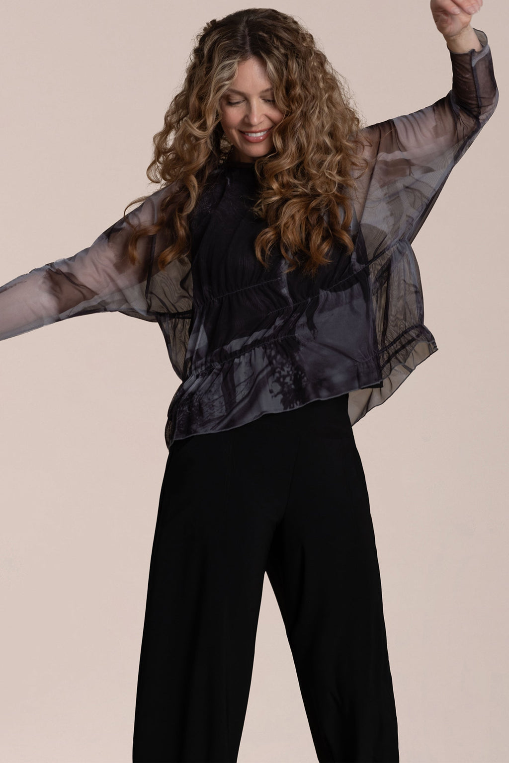Effortless fluidity with a touch of edge. The Barely Wabi Sabi Top brings shape and dimension to sheer layering with internal elastic detailing that creates the effect of soft gathers and drape. Its long sheer sleeves and crew neckline strike a balance between structure and softness, while the flowy fit skims away from the body. Best styled over our Flared Shell, this piece offers an artful layered look with modern ease.