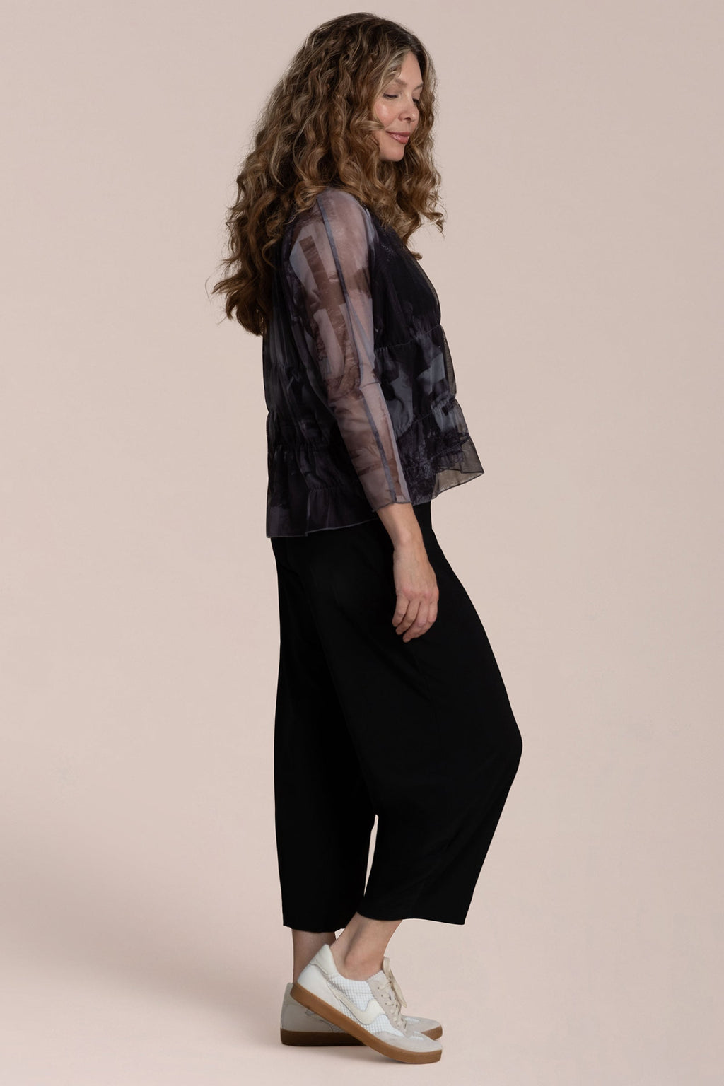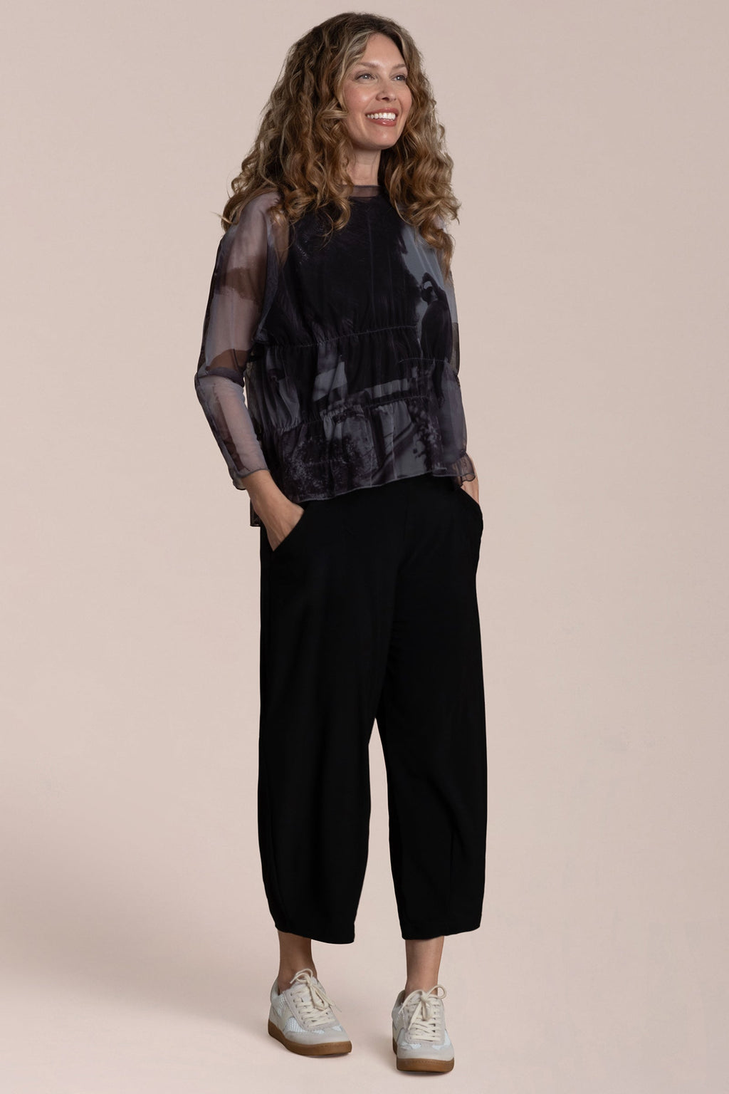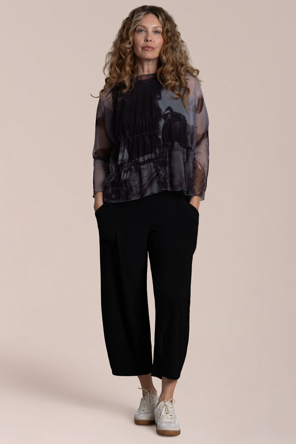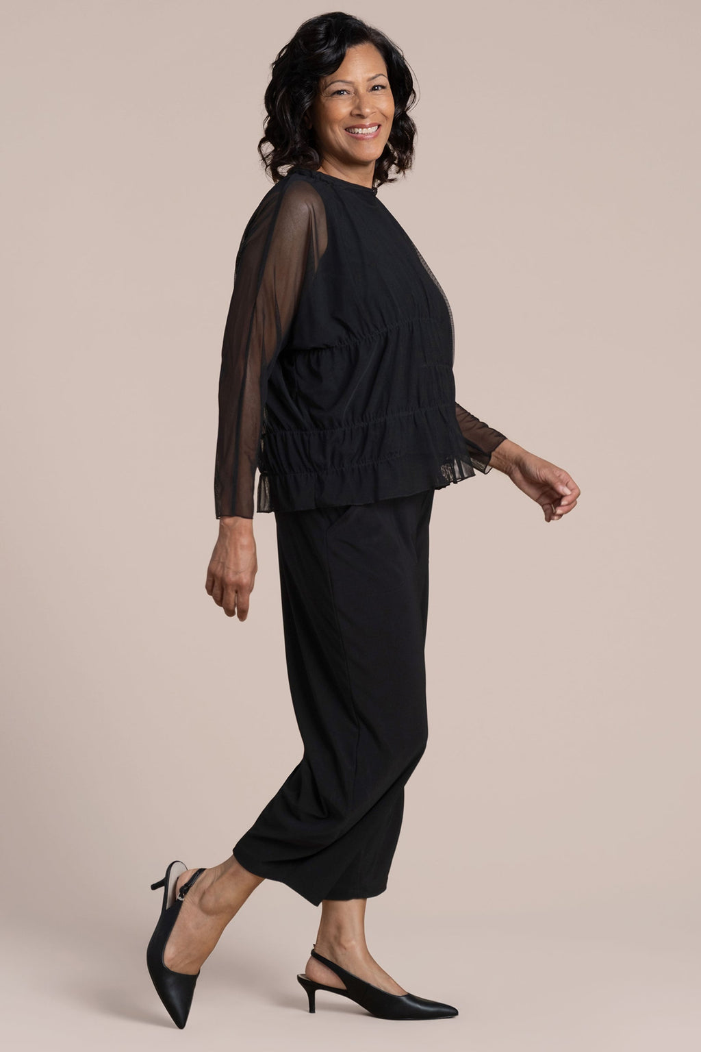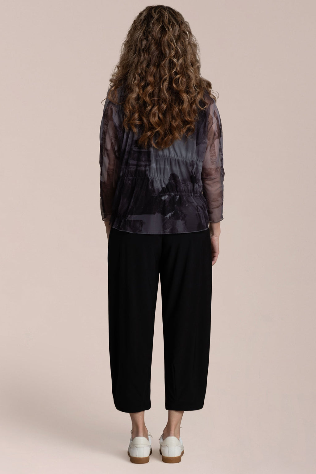 Effortless fluidity with a touch of edge. The Barely Wabi Sabi Top brings shape and dimension to sheer layering with internal elastic detailing that creates the effect of soft gathers and drape. Its long sheer sleeves and crew neckline strike a balance between structure and softness, while the flowy fit skims away from the body. Best styled over our Flared Shell, this piece offers an artful layered look with modern ease.