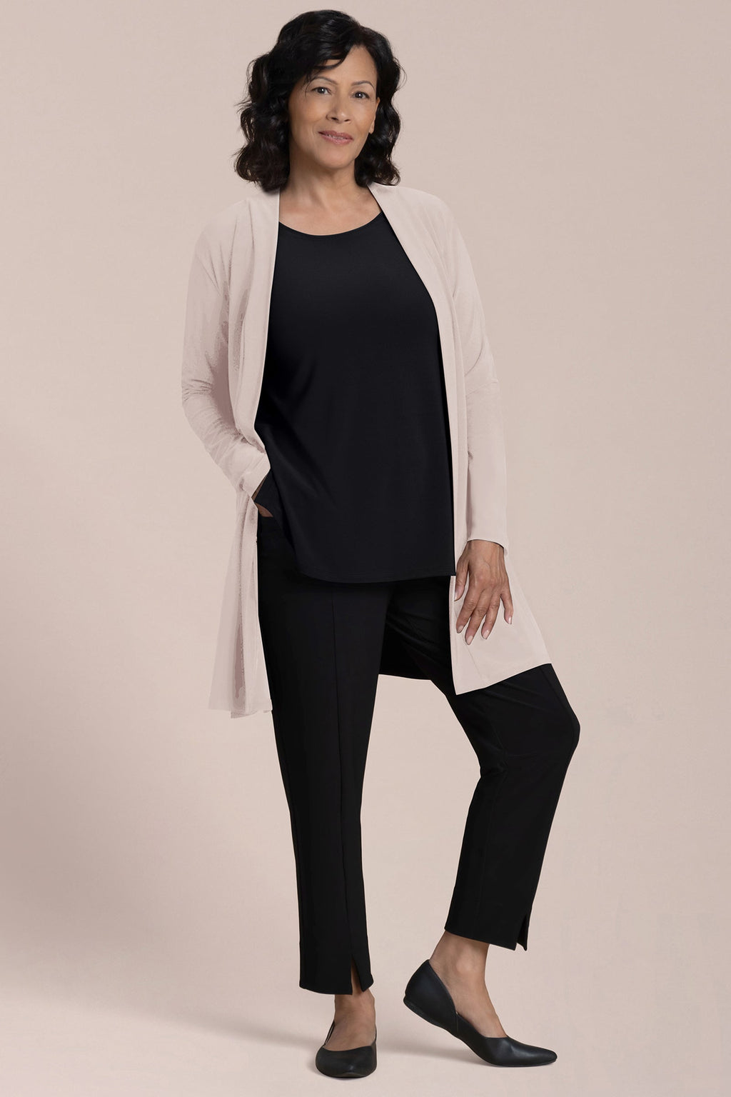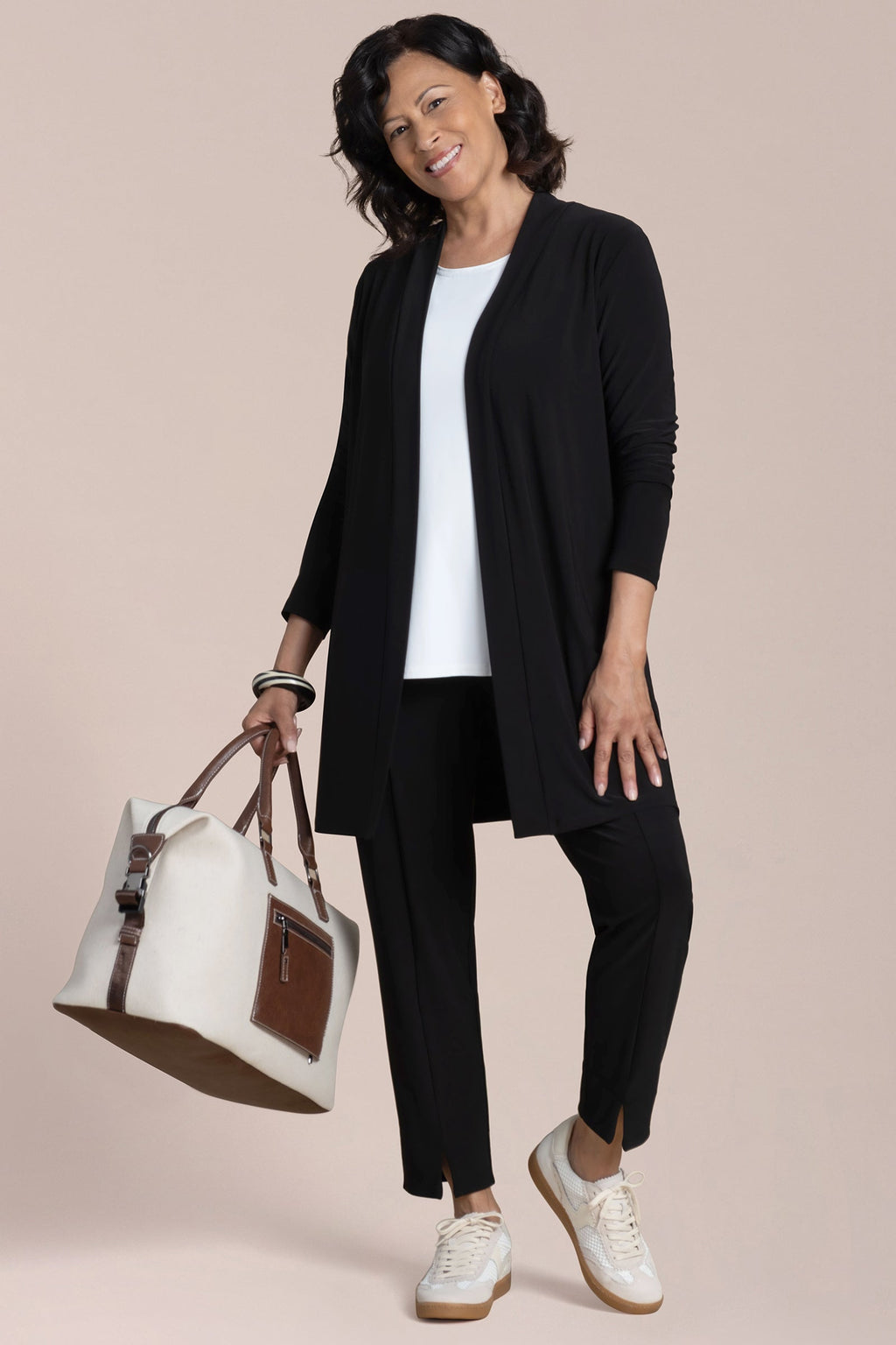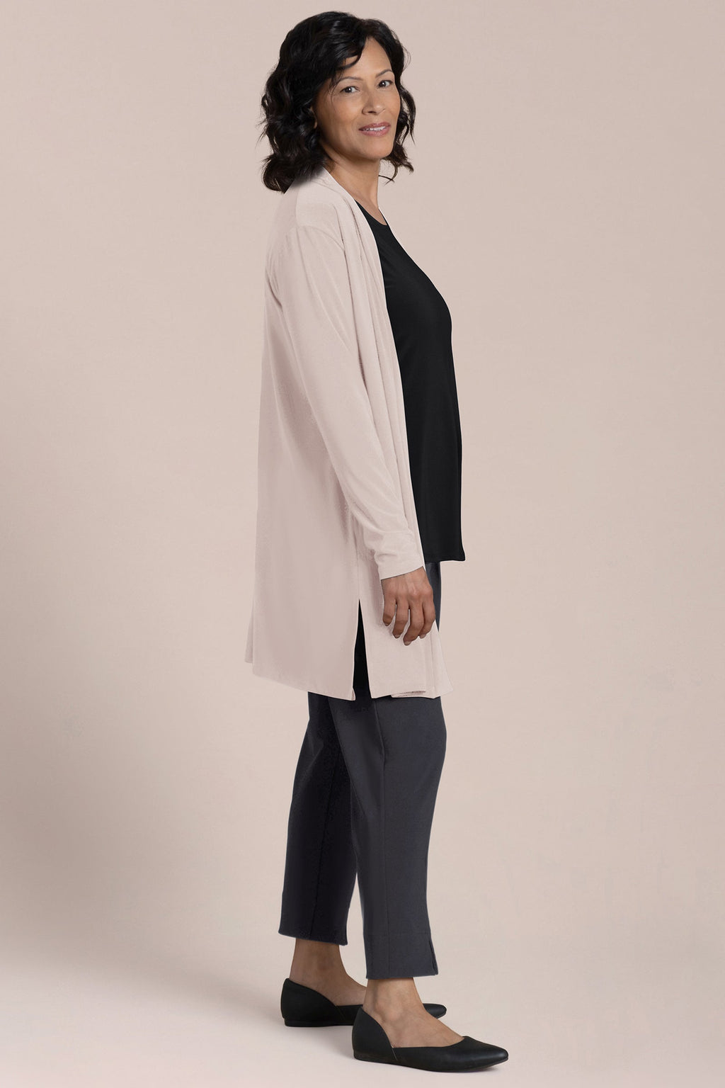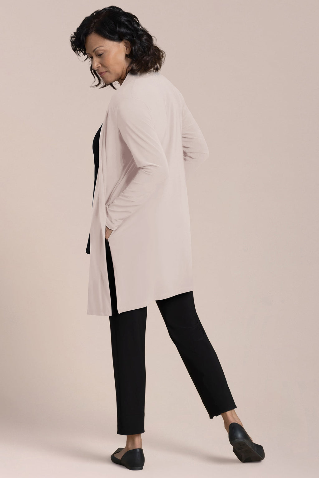 A throw-on-and-go essential with effortless polish. The Carefree Cover is a longline open cardigan with soft structure and movement. Its clean lines, full-length sleeves, and side slits offer ease and elegance—perfect for layering over any look, from long travel days to casual evenings out. Side seam pockets add discreet functionality without disrupting the streamlined silhouette.
