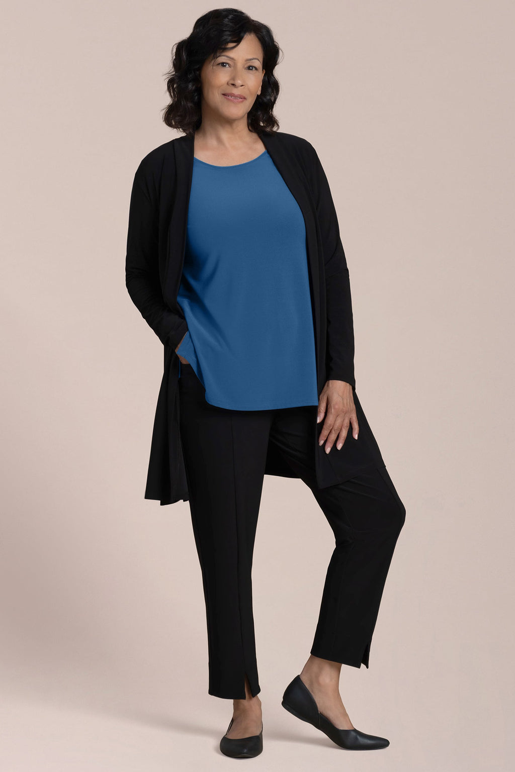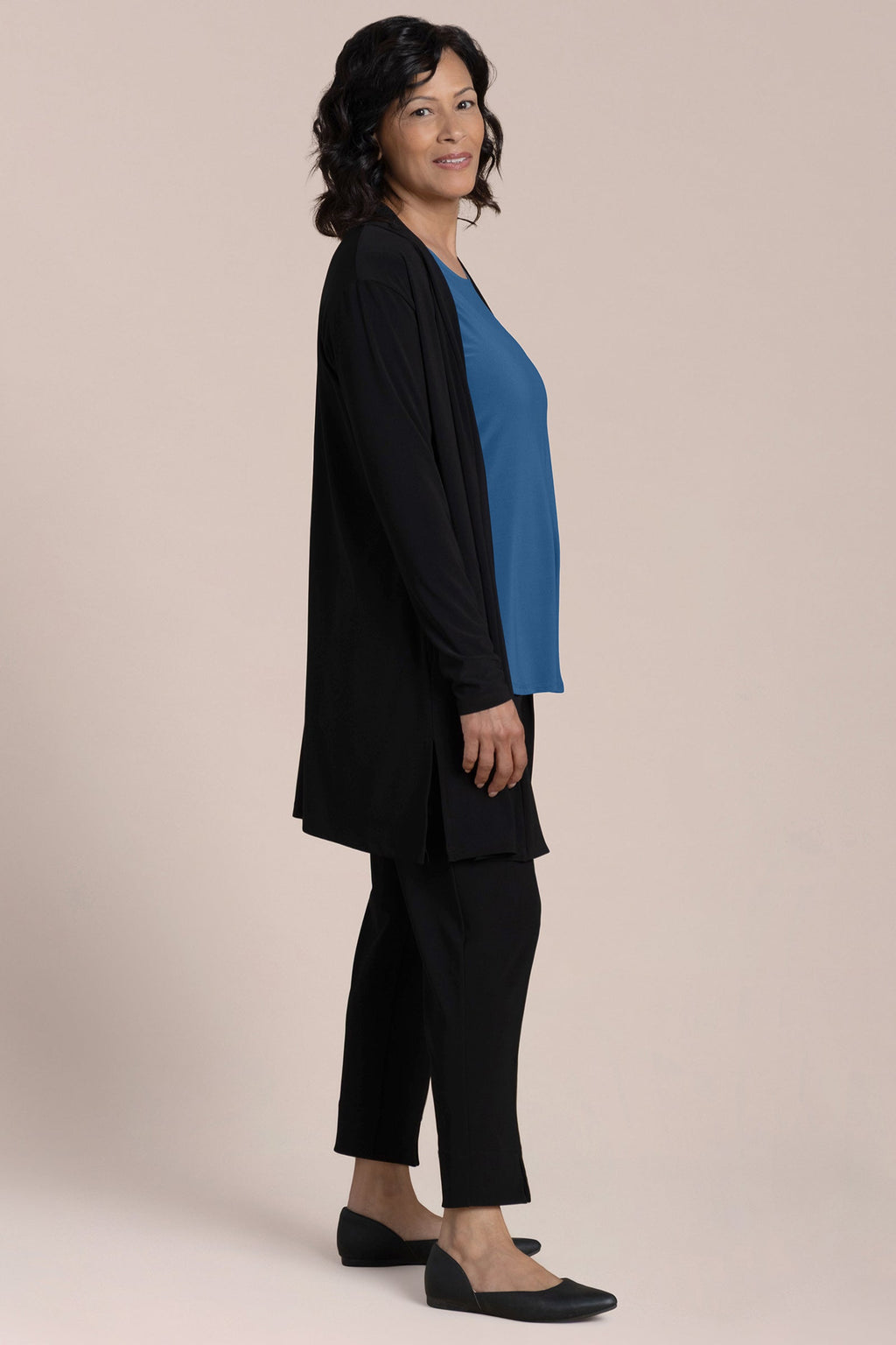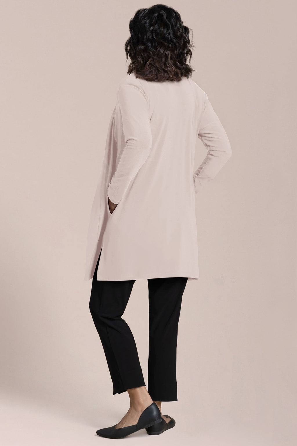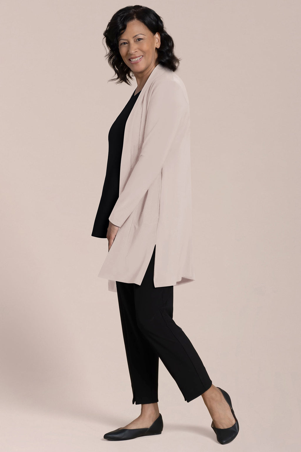 A throw-on-and-go essential with effortless polish. The Carefree Cover is a longline open cardigan with soft structure and movement. Its clean lines, full-length sleeves, and side slits offer ease and elegance—perfect for layering over any look, from long travel days to casual evenings out. Side seam pockets add discreet functionality without disrupting the streamlined silhouette.