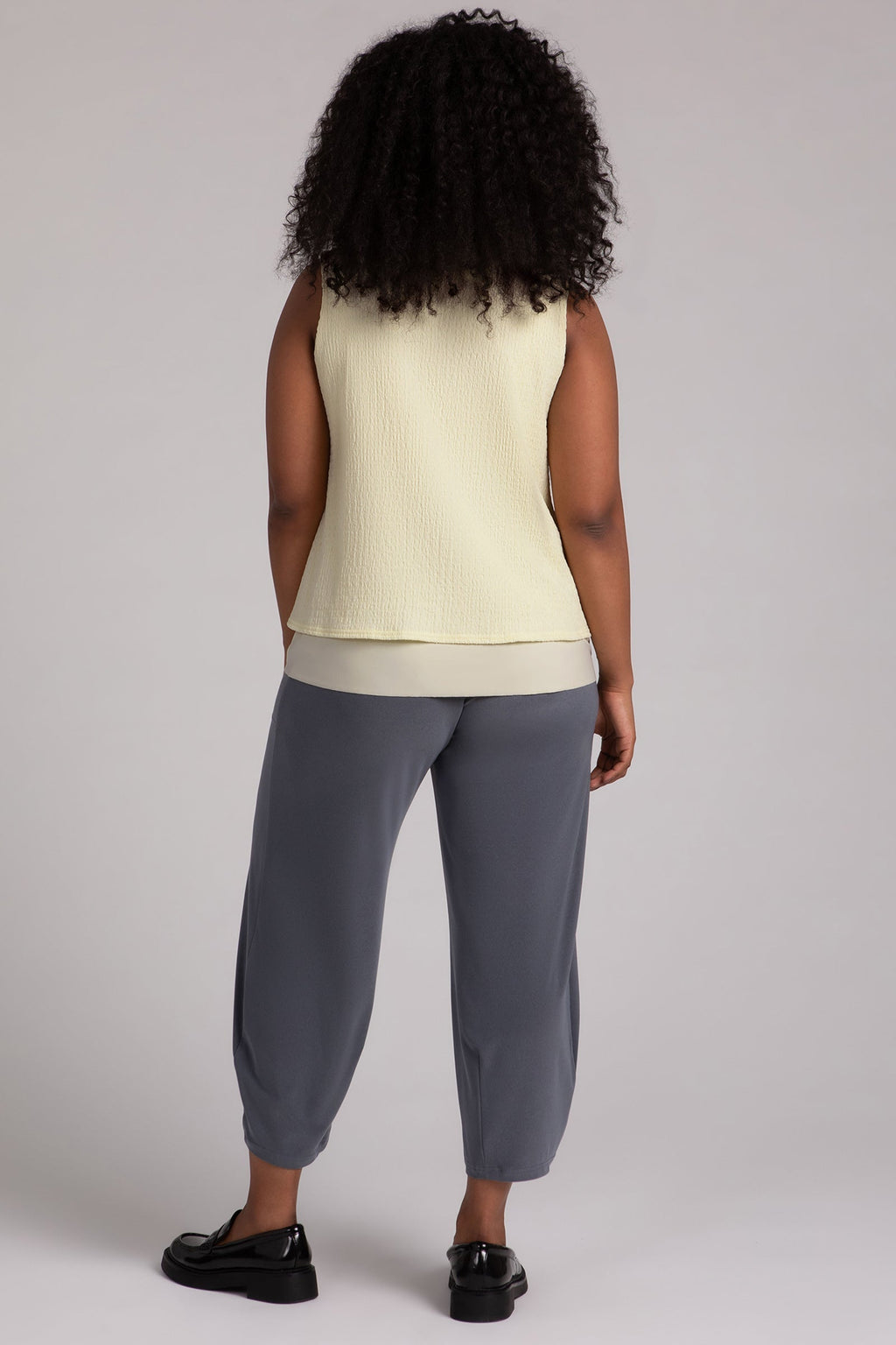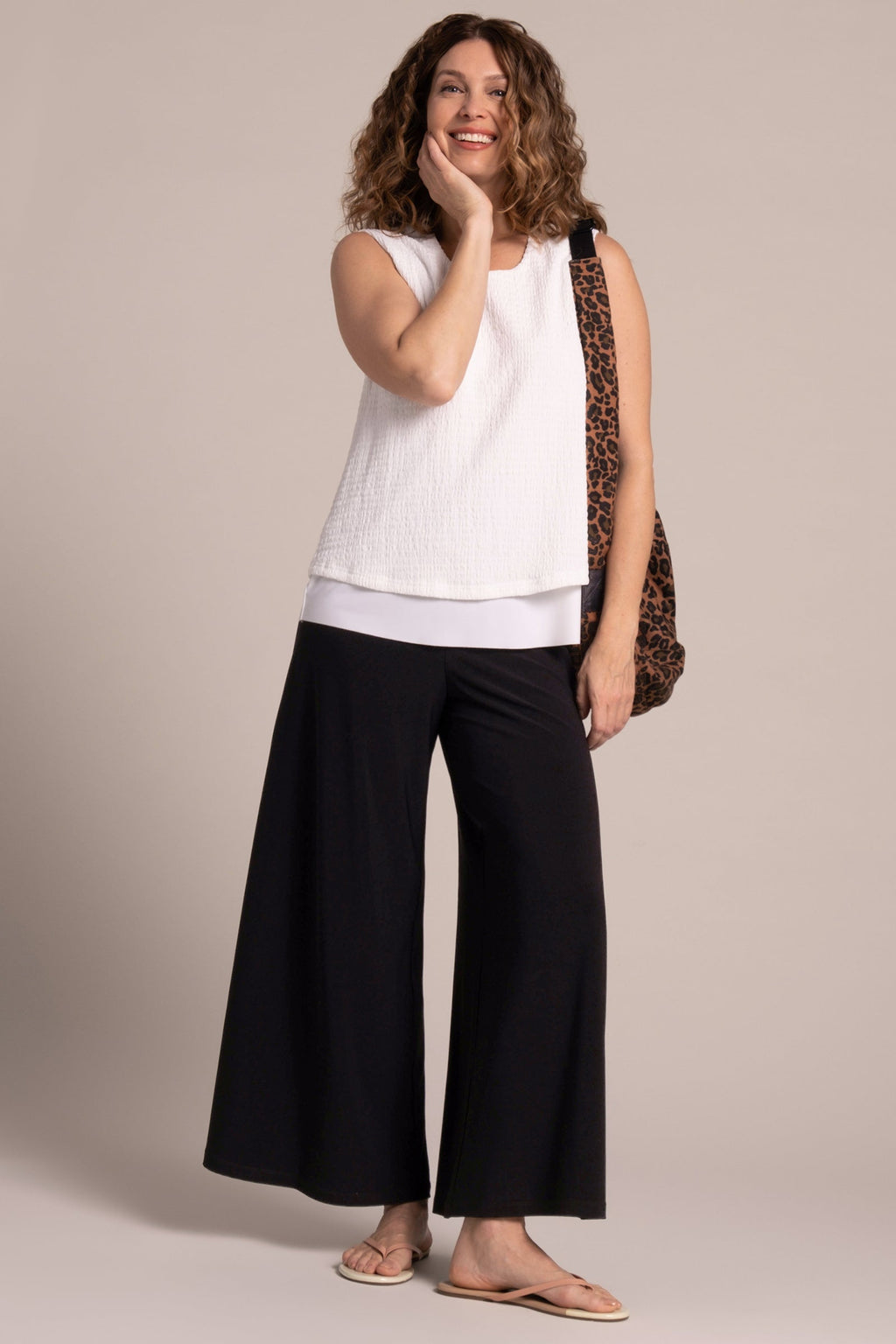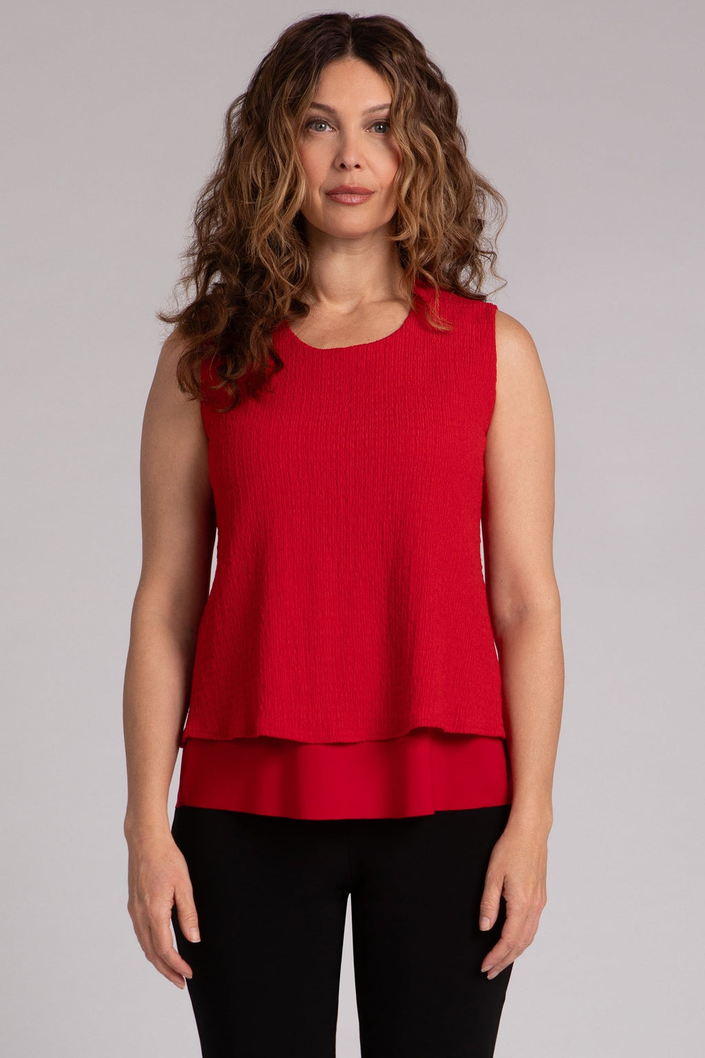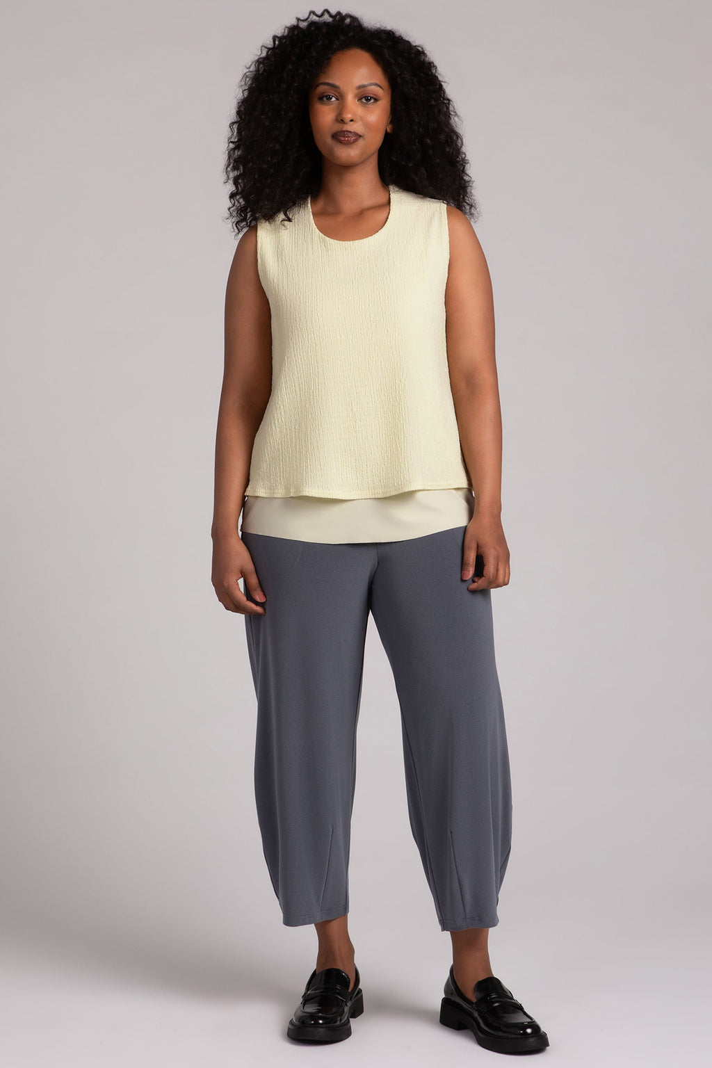 Our Sleeveless Double Layer Shell in Popcorn Waffle offers versatility and style. Fully lined with jersey, it features a clean finish on the scooped neckline. Ideal for layering under a cardigan or blazer, or as a standalone piece paired with any bottoms.