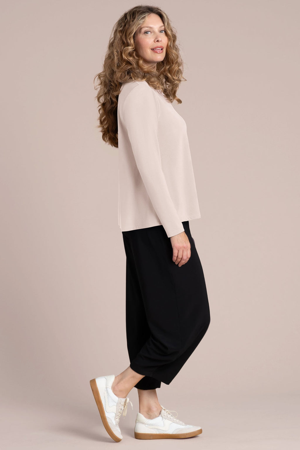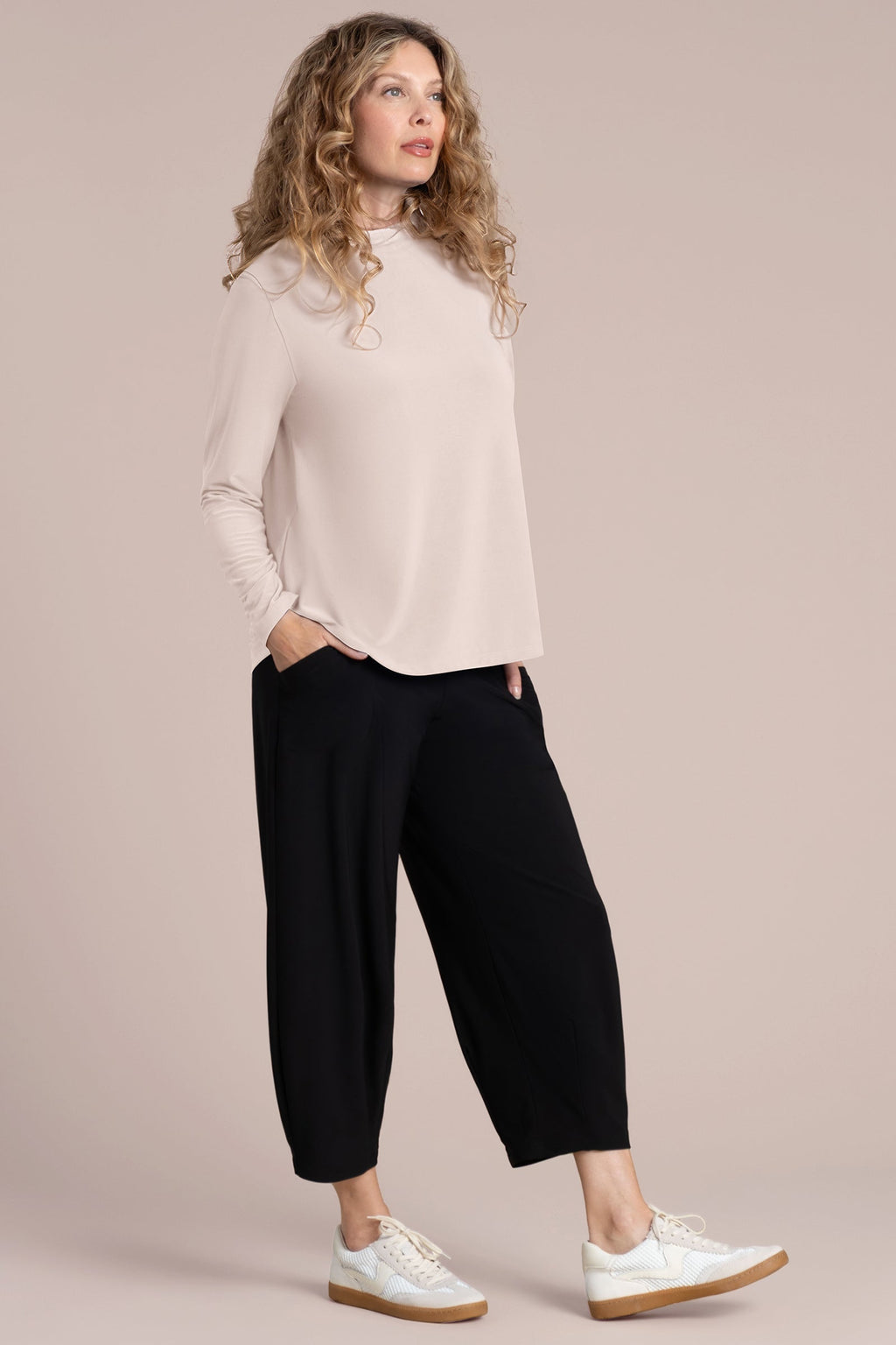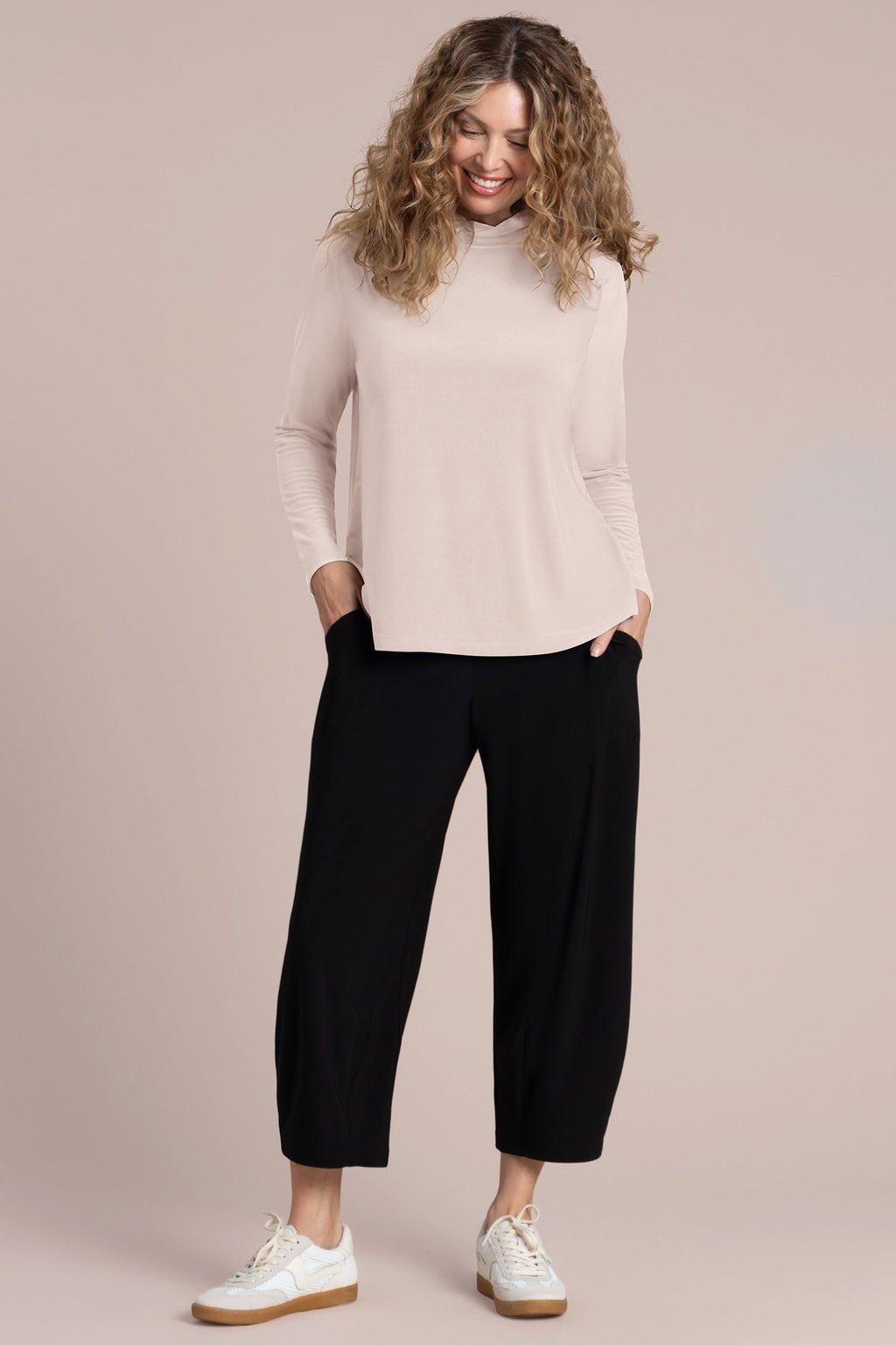 With clean lines and a softly structured silhouette, the Echo Mock Neck Top is a sophisticated layering essential. Featuring a relaxed fit, long sleeves, and a subtle mock neckline, this top delivers modern elegance with everyday ease. The curved hem adds gentle shape, while the smooth jersey knit offers stretch and comfort. Perfect on its own or under a jacket, this top pairs effortlessly with wide-leg pants, cropped styles, or your favourite denim.