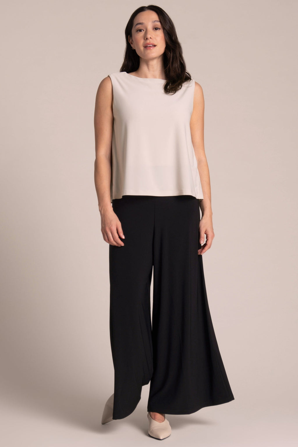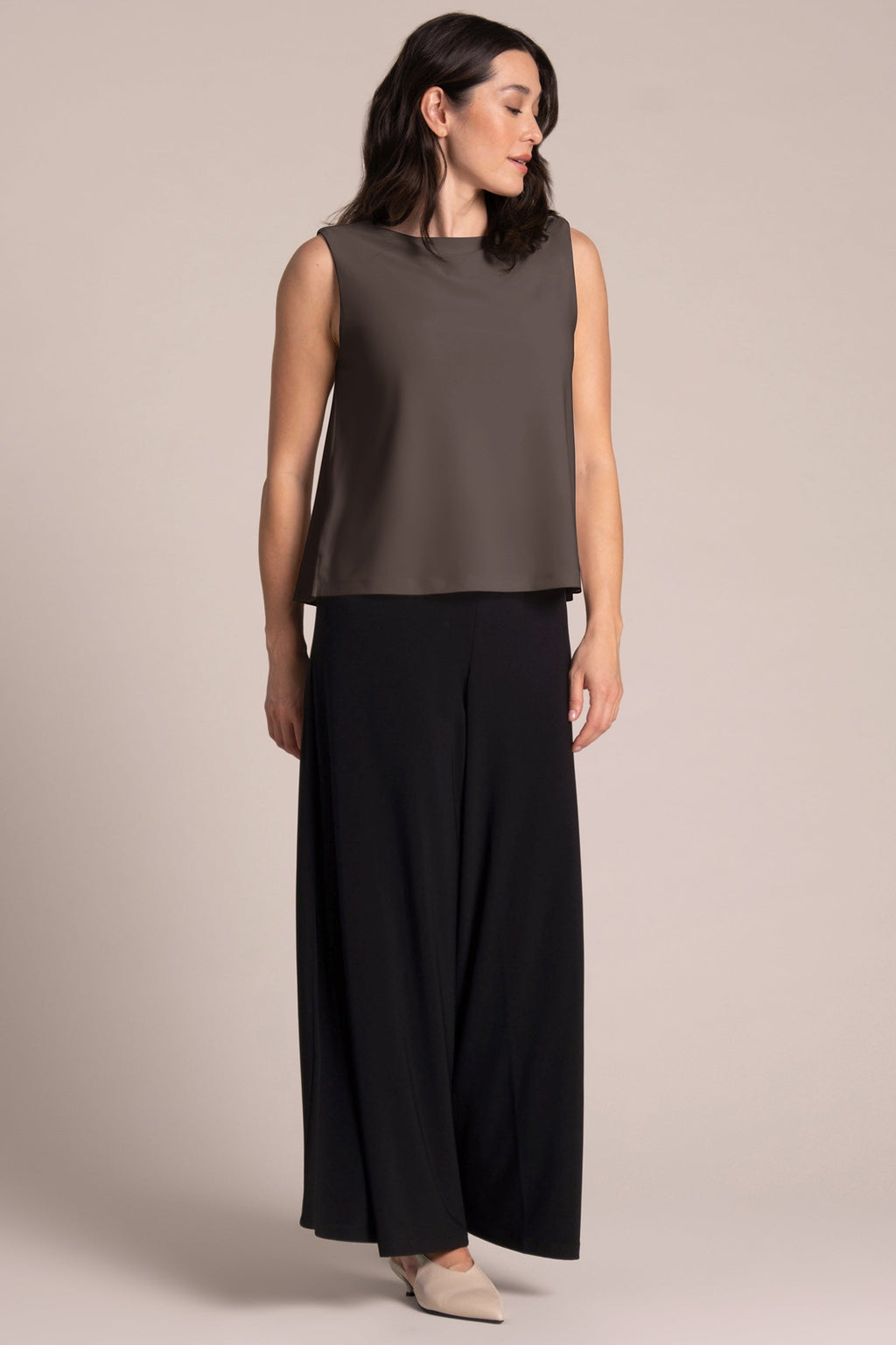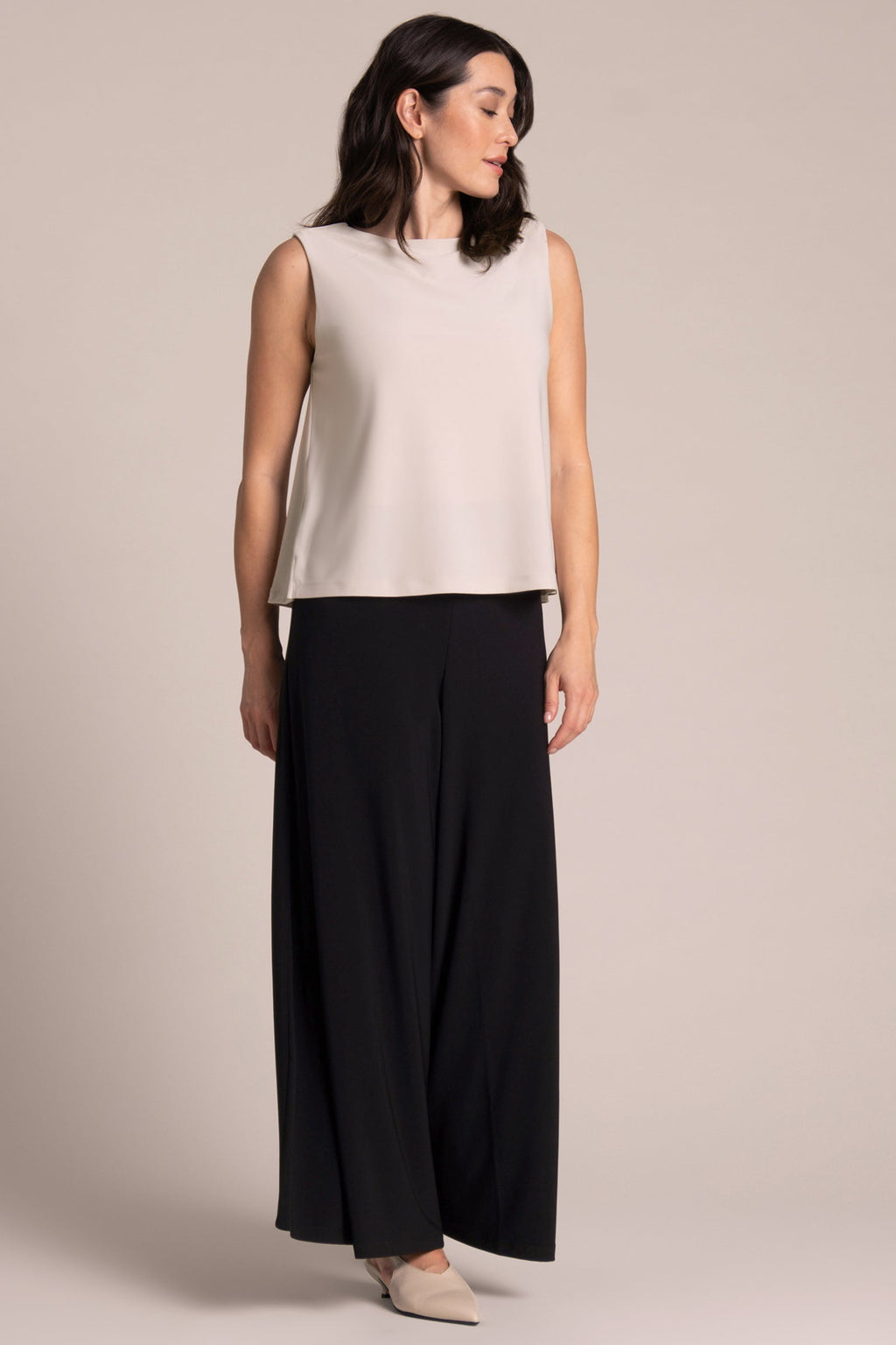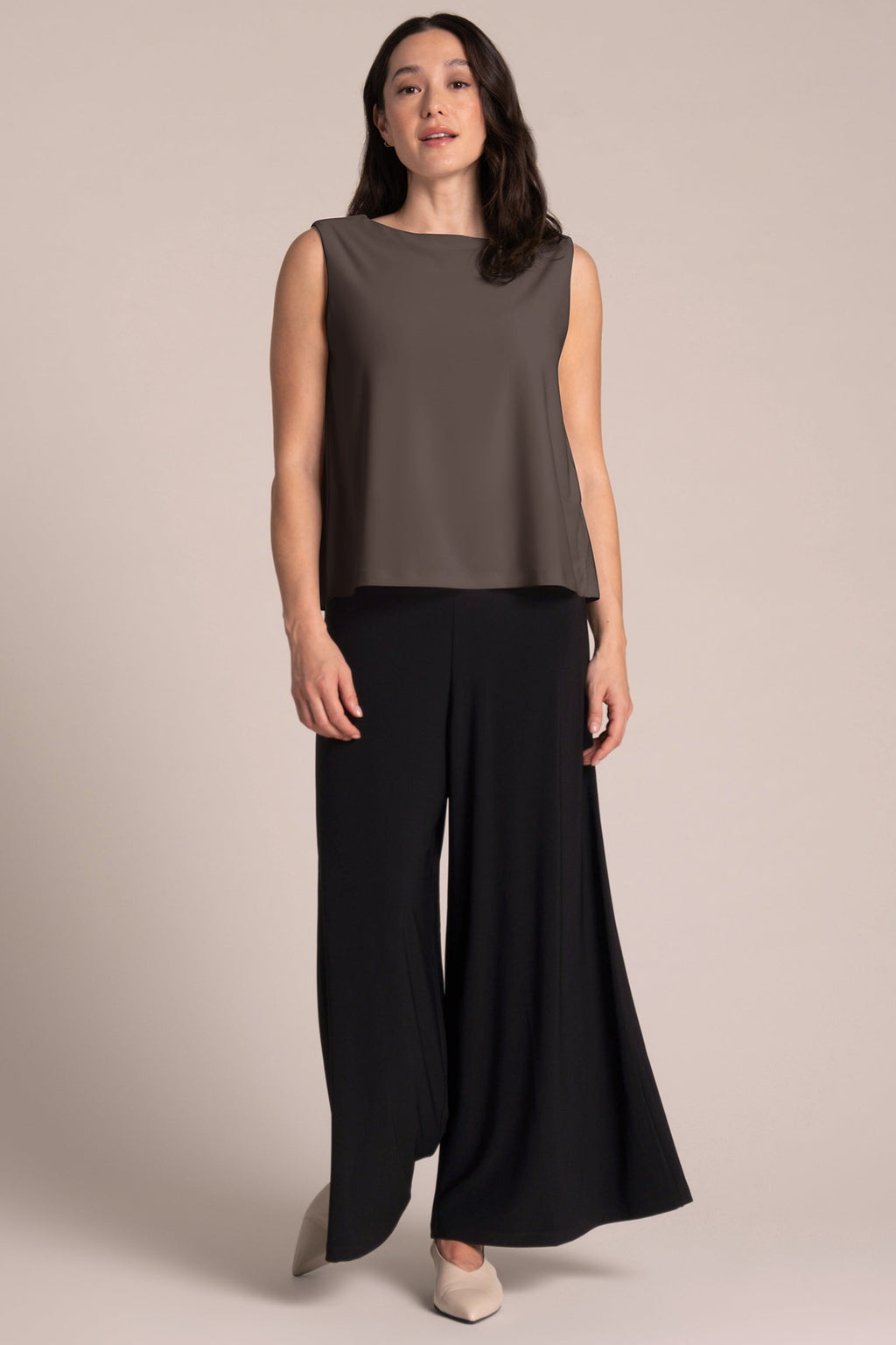The Flared Shell features a flattering boat neckline, relaxed, boxy fit, and the added comfort of being double-lined in the front and back. This tank pairs seamlessly with wide leg pants for a casual sophisticated ensemble.