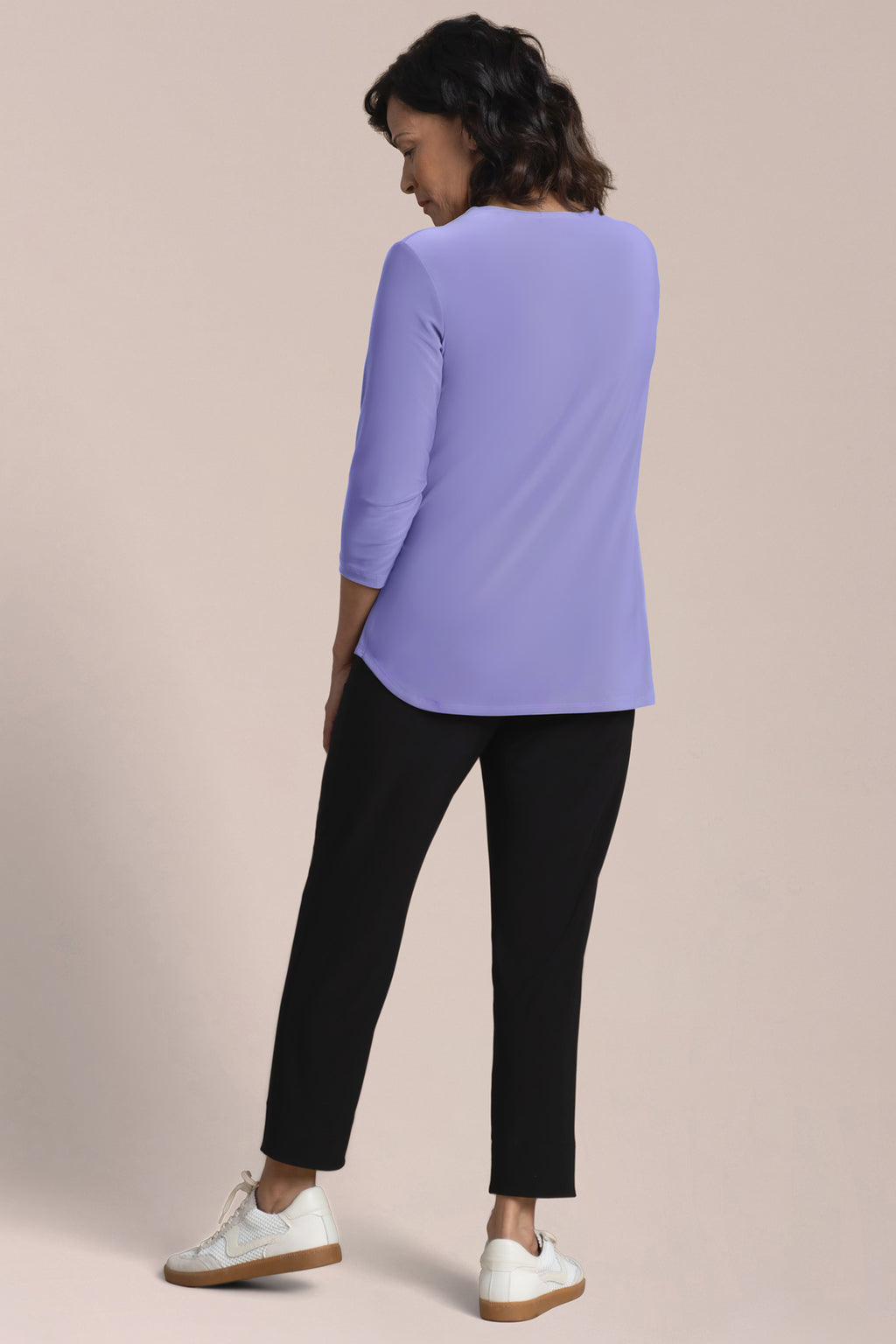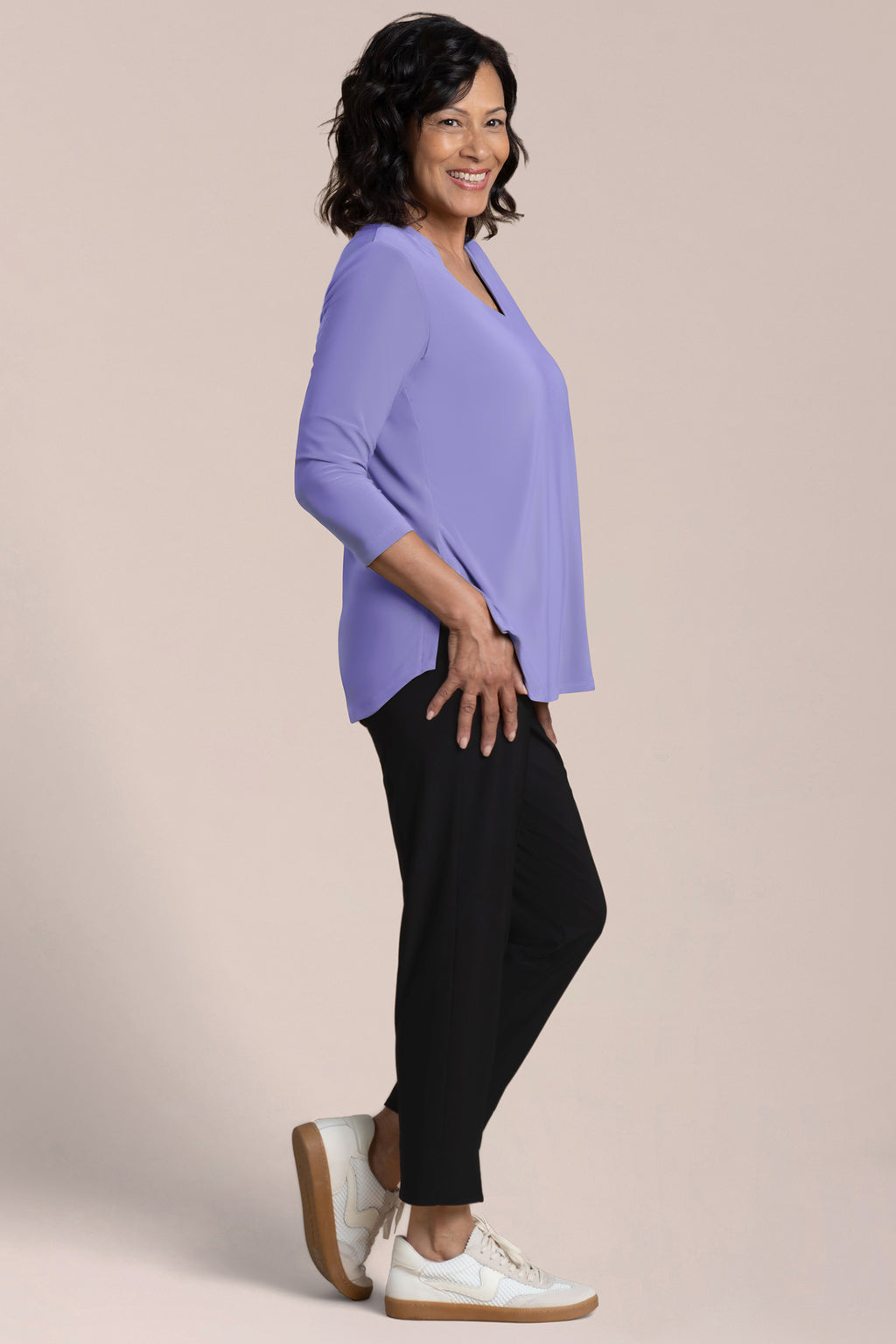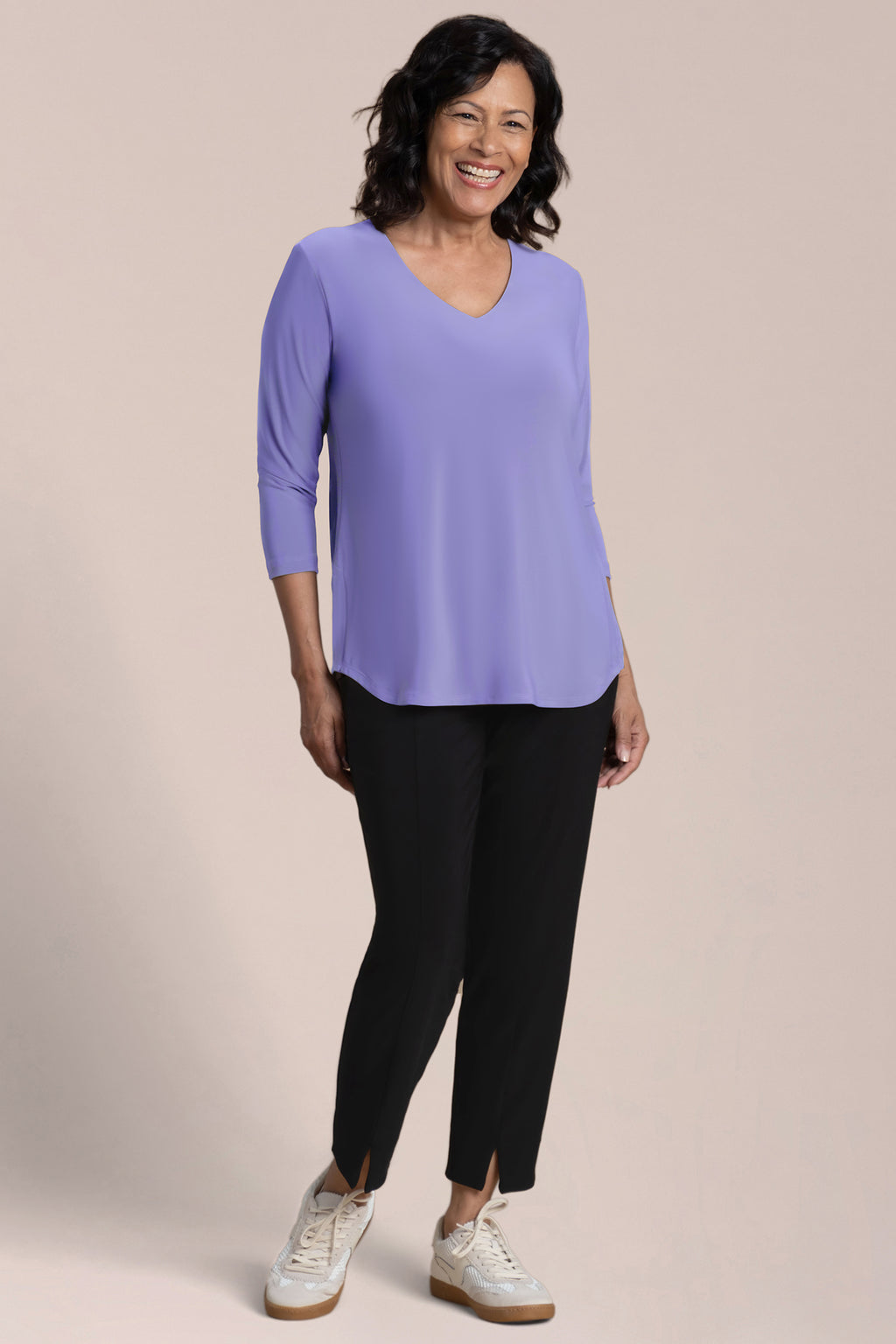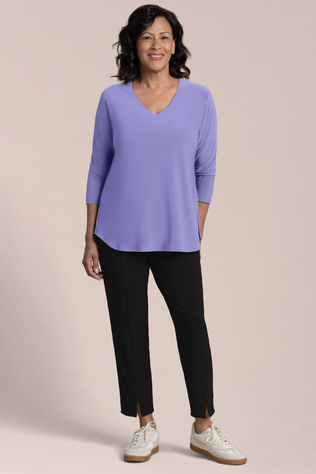 A refined essential with everyday ease. The Go To Soft V-Neck Top features a clean-finished neckline, 3/4 sleeves, and a relaxed silhouette that drapes effortlessly. The double-layered front panel offers added coverage, while soft jersey and subtle side slits enhance comfort and movement. It’s the versatile piece your wardrobe will rely on.