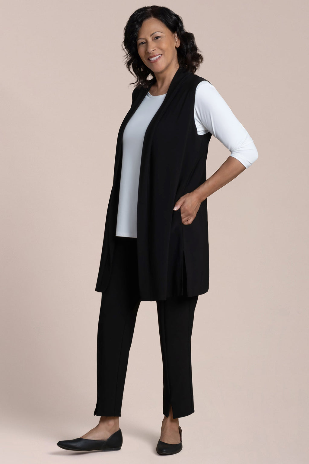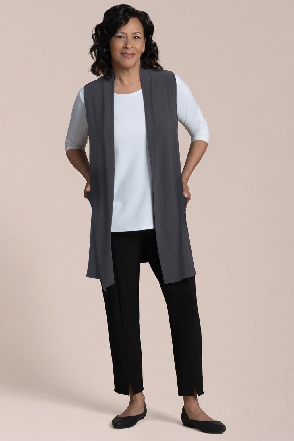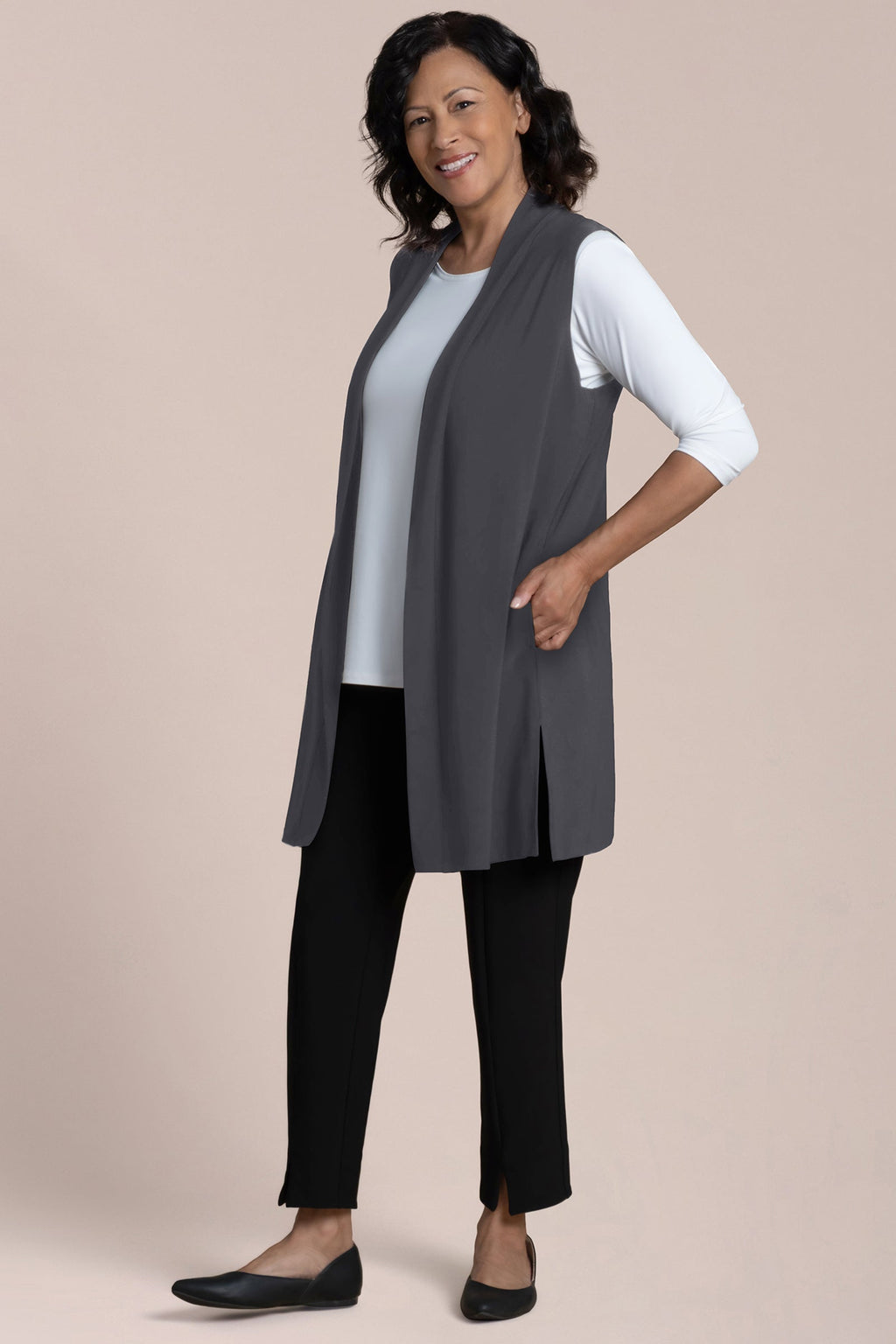 A laid-back layer for effortless elegance. The Carefree Vest flows with movement and ease, thanks to its long, open silhouette and fluid drape. The extended length adds polish, while deep side slits keep things light and breezy. Side seam pockets add subtle functionality, making it a wardrobe essential for completing any look—from casual to refined.