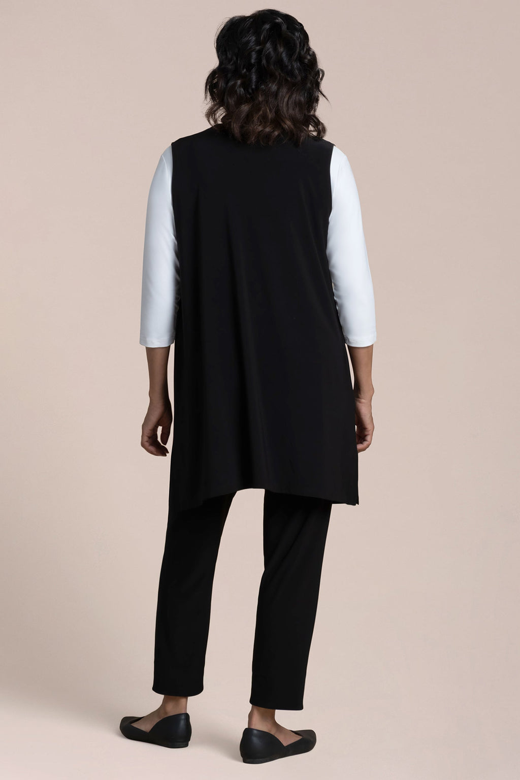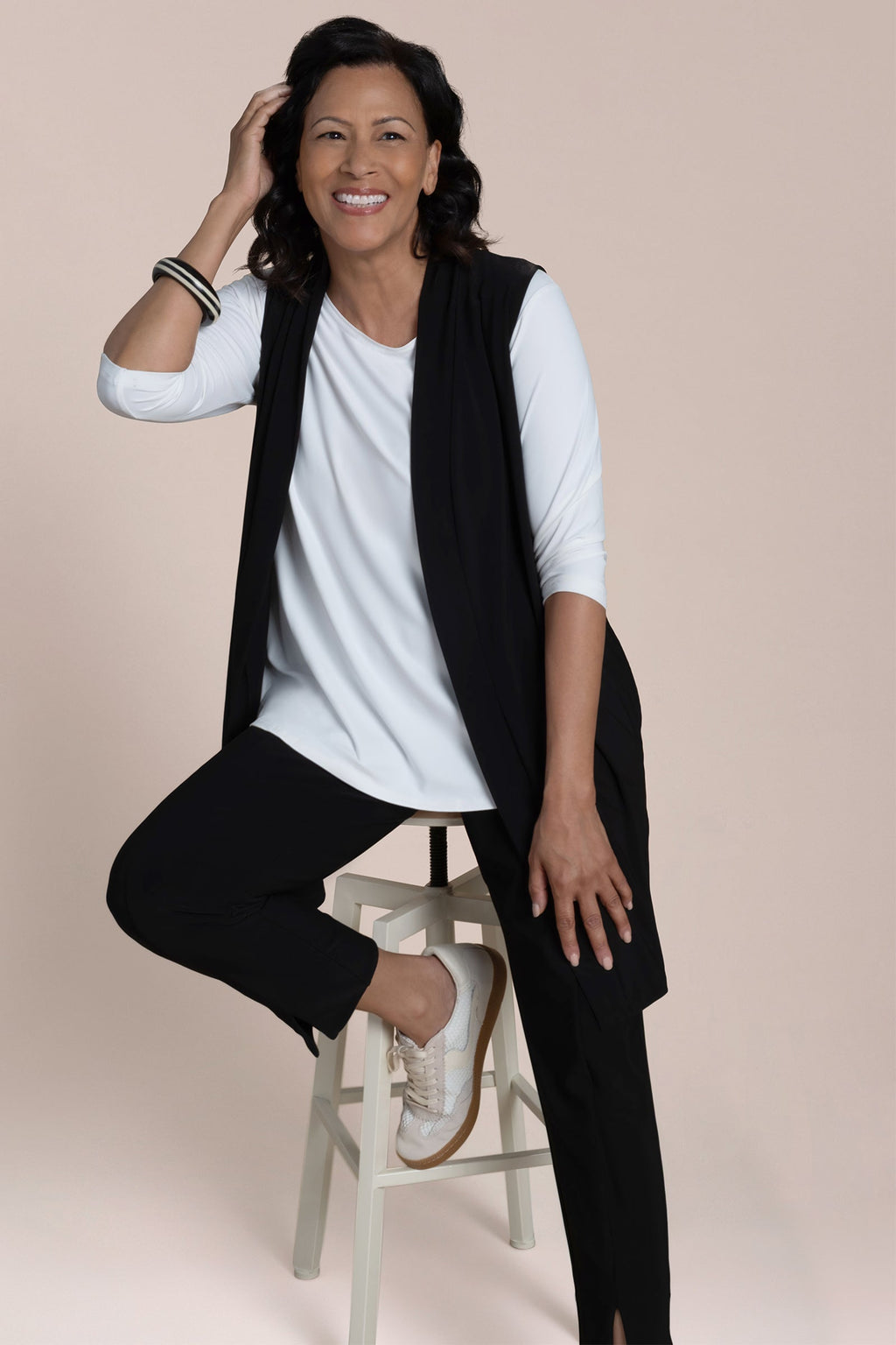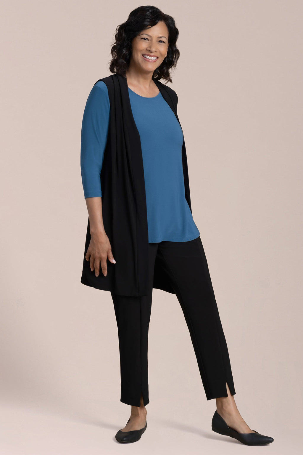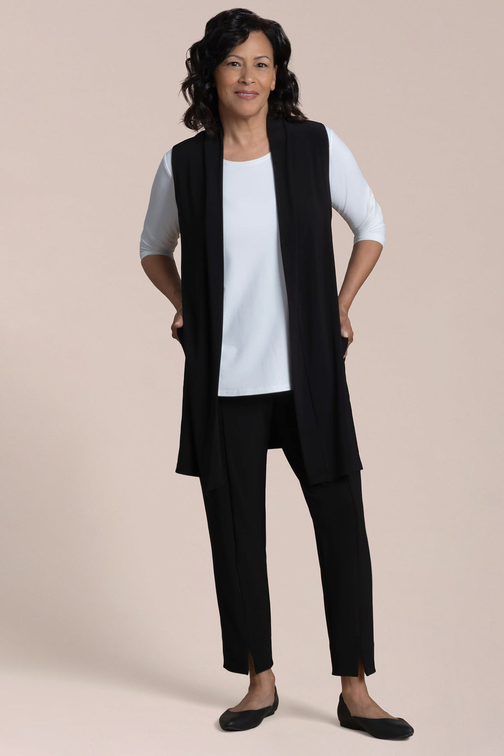 A laid-back layer for effortless elegance. The Carefree Vest flows with movement and ease, thanks to its long, open silhouette and fluid drape. The extended length adds polish, while deep side slits keep things light and breezy. Side seam pockets add subtle functionality, making it a wardrobe essential for completing any look—from casual to refined.