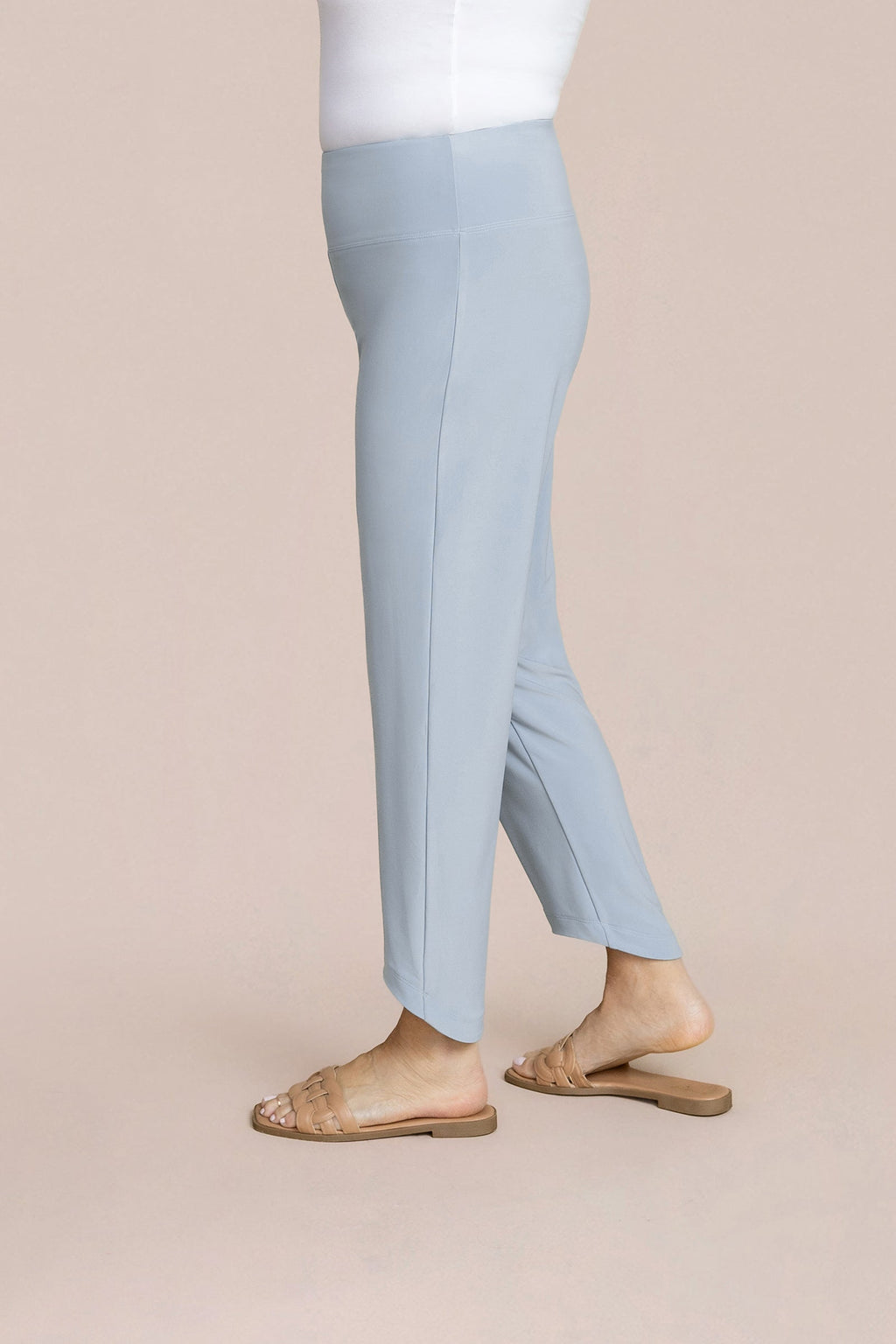 This straight pant has a comfortable yoke waistband and features a soft curved step hem flattering with draped tops.