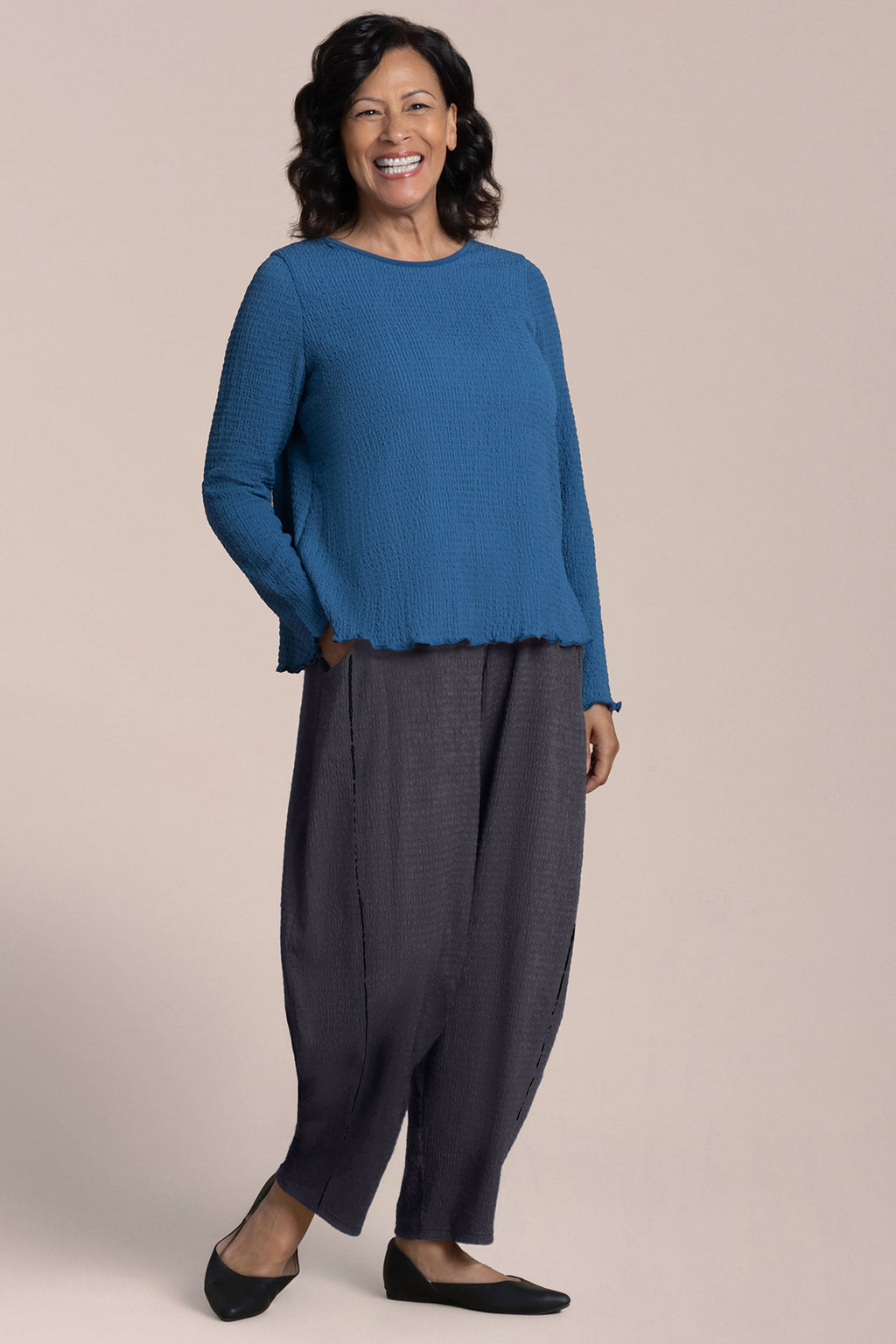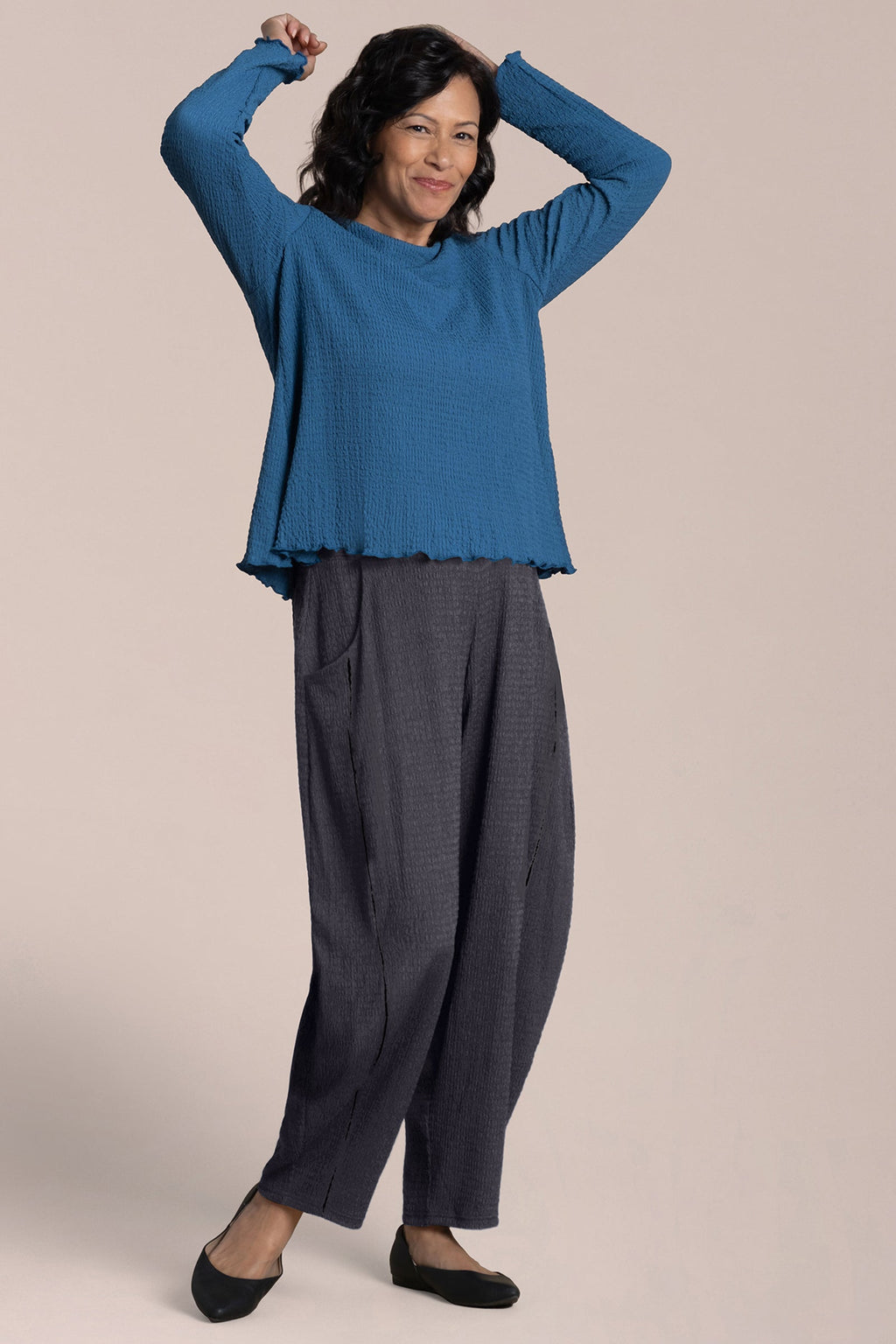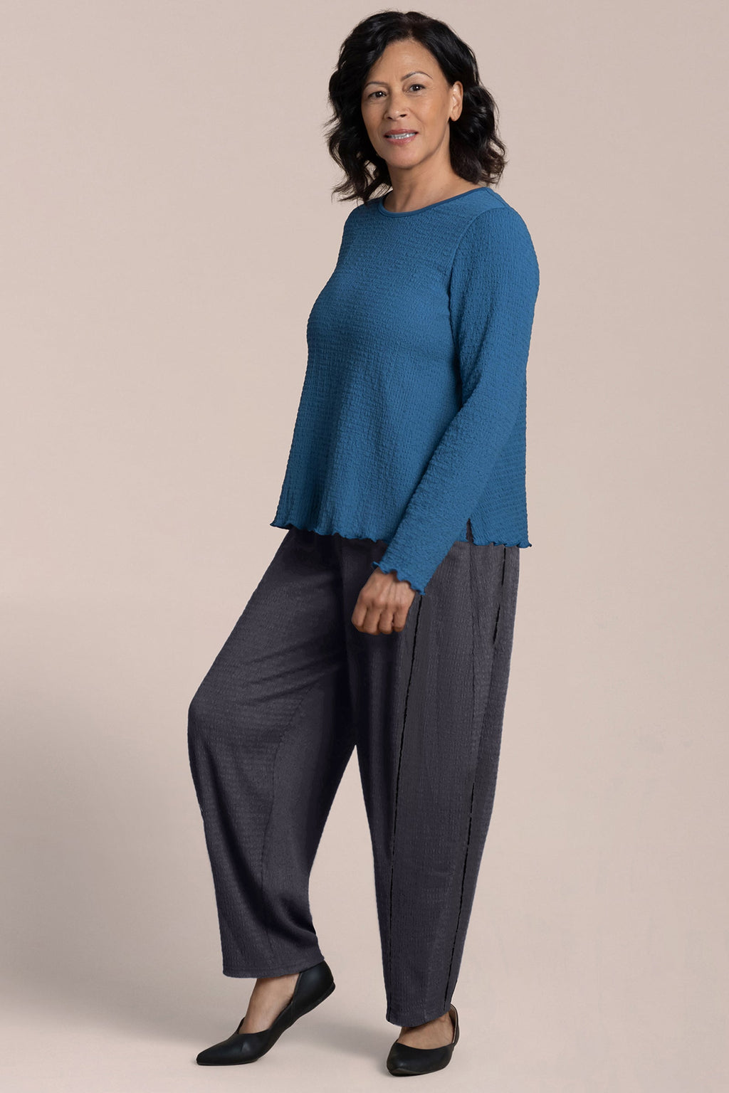 The Pop Crew Neck Top is a wardrobe essential, featuring a scalloped lettuce hem for added interest. Its shorter length makes it the perfect match for wide-leg pants.