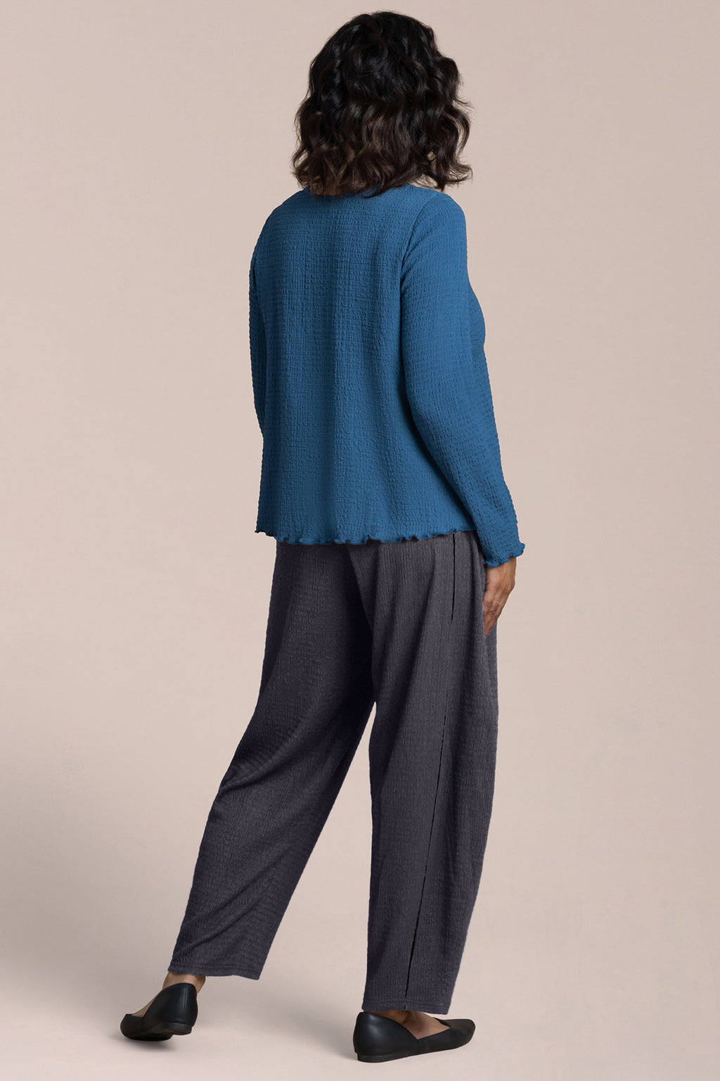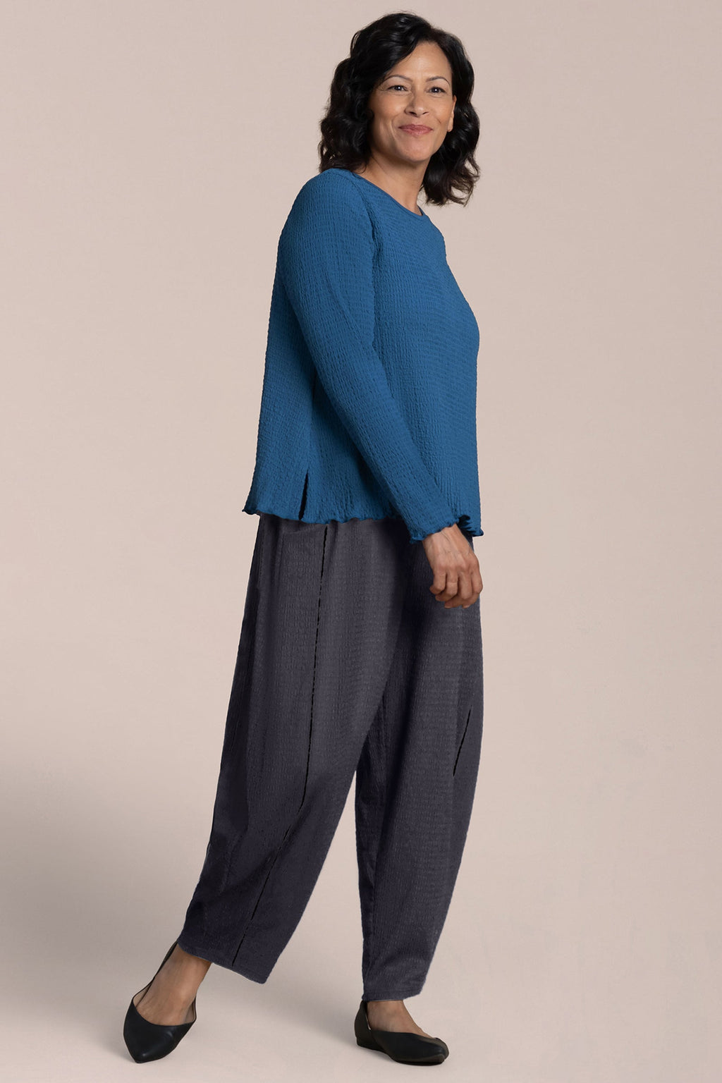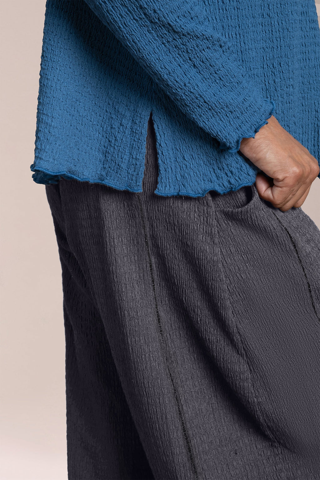 The Pop Crew Neck Top is a wardrobe essential, featuring a scalloped lettuce hem for added interest. Its shorter length makes it the perfect match for wide-leg pants.